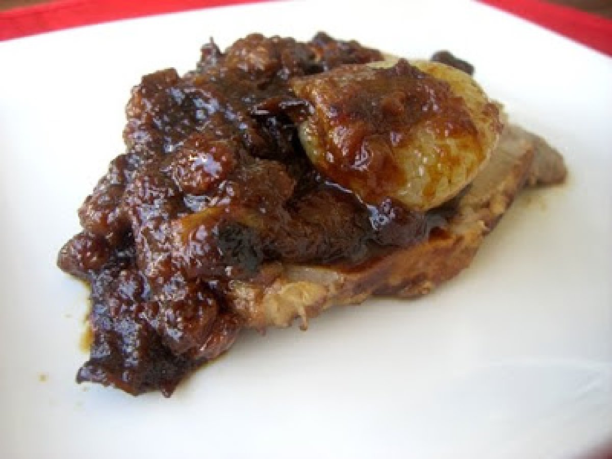 Arista in agrodolce con cipolline, mele, prugne e uvetta