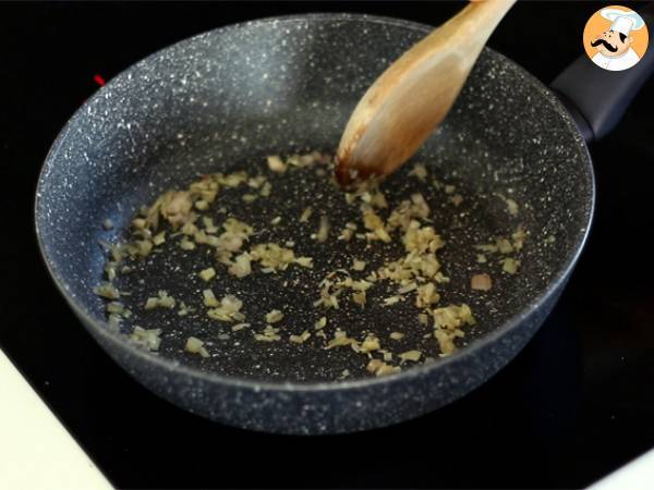 Lavate e pulite i funghi e lo scalogno, poi tagliateli in brunoise (conservate un po' di funghi). Tritate anche il prezzemolo. Adesso soffriggete lo scalogno per qualche minuto in un filo d'olio.
