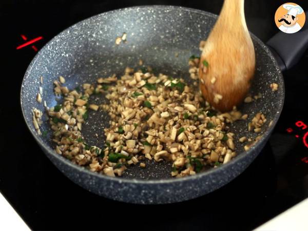 Aggiungete anche i funghi e rosolate per qualche minuto. Aggiungete il prezzemolo, mescolate e mettete da parte.