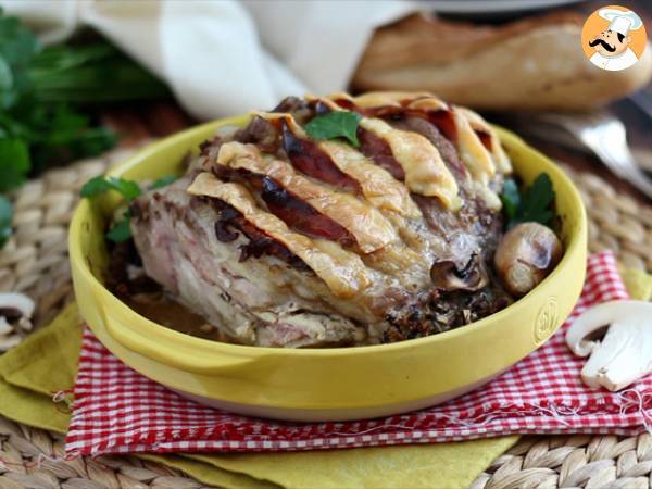 Tagliate a fette l'arrosto senza andare fino in fondo (a fisarmonica). Guarnite l'arrosto con la farcia ai funghi, poi inserite in ogni intaglio una fetta di emmental e una di bacon.