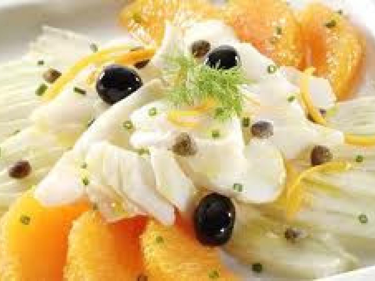 Baccalà marinato con arancia,finocchi e olive nere Portata principalefacile45 min Invia questa ricetta ad un amico Stampa la ricetta Contatta l'autore della Ricetta Pubblica la foto di questa ricetta Ingredienti 6 1 baffa di baccala dissalato da 600 g 1 arancia 1/2 finocchio 1 cucchiaino di succo di arancia olio extravergine di oliva sale pepe insaporitori Ariosto per pesce 1 manciata di olive nere