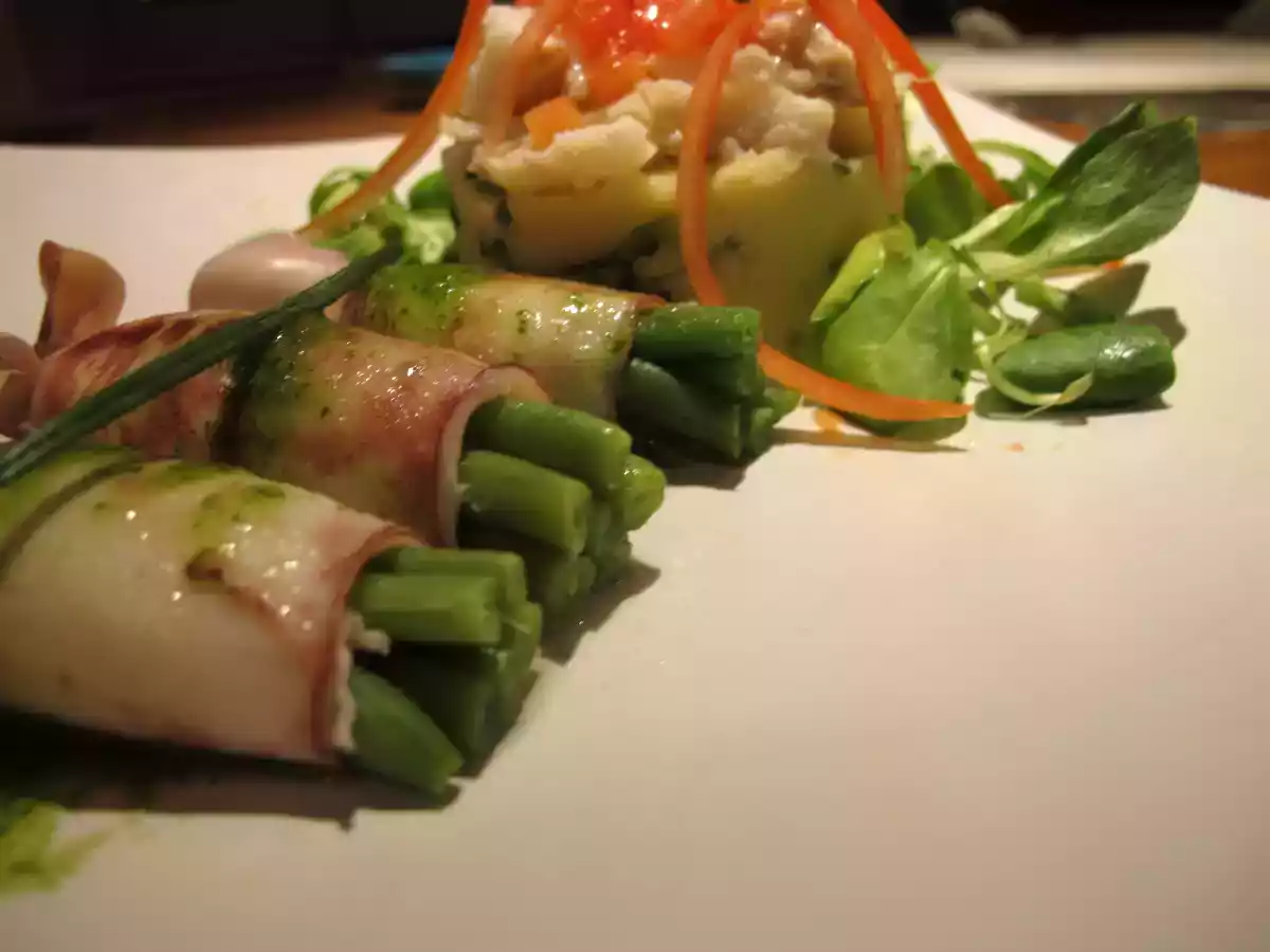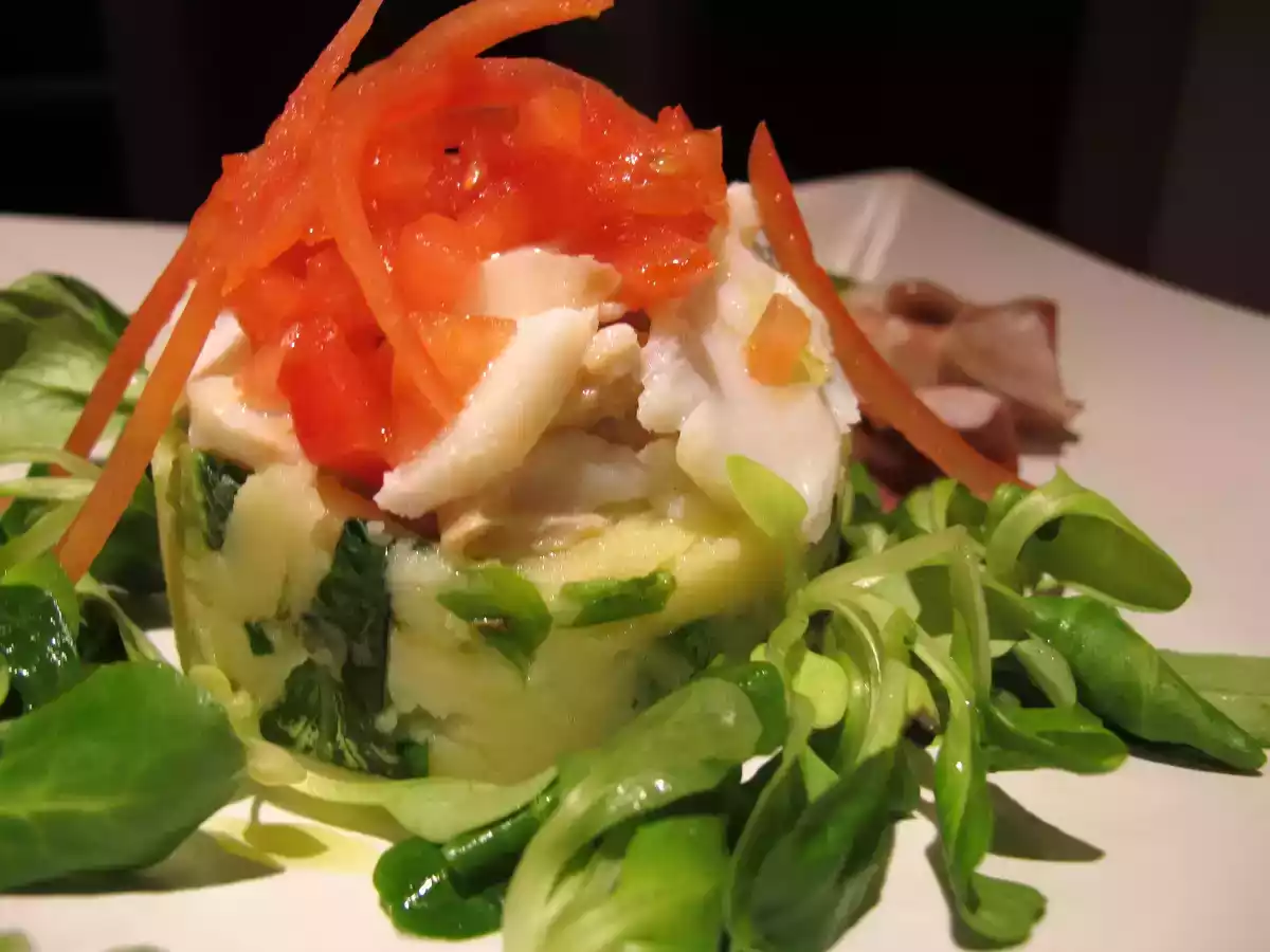 Baccalà tiepido su schiacciata di patate, totani ripieni di fagiolini, olio al basilico PrecedenteProssimo Portata principalemedia35 min Invia questa ricetta ad un amico Stampa la ricetta Contatta l'autore della Ricetta Pubblica la foto di questa ricetta Ingredienti 4 500 g di baccalà ammollato 1/2 litro di latte 5 pomodori perini 4 piccole patate lesse Il succo di mezzo limone Soncino Erba cipollina 6/12 totani (secondo pezzatura) 200 g di fagiolini 1 l di fumetto di pesce Basilico Sale, pepe, olio EVO