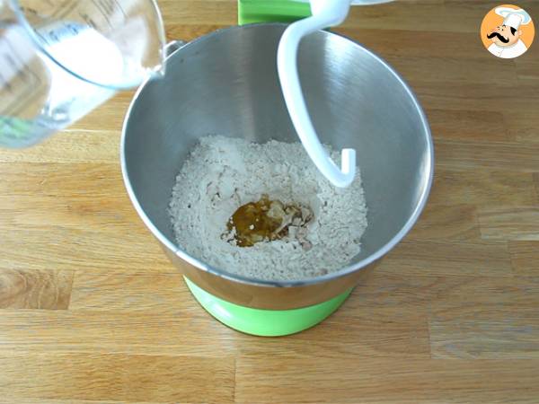 Mettete tutti gli ingredienti dell'impasto in una ciotola facendo attenzione a non far entrare in contatto il lievito con il sale. Quindi mescolate fino ad avere un impasto omogeneo ed inseguito impastate per 5 minuti.
