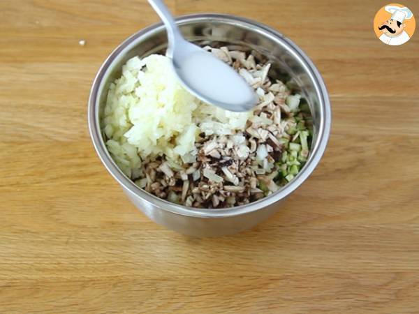 Sbucciate e tagliate le carote finemente. Fate la stessa cosa con la cipolla ed infine tagliate anche i funghi e la zucchina (senza togliere la buccia). Aggiungete un cucchiaio raso di sale ,mescolate per bene e lasciate riposare per 5 minuti.