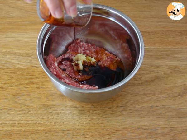 Adesso aggiungete gli spicchi di aglio schiacciati alla carne di maiale. Poi conditela con la salsa di soia e l'olio d'oliva.