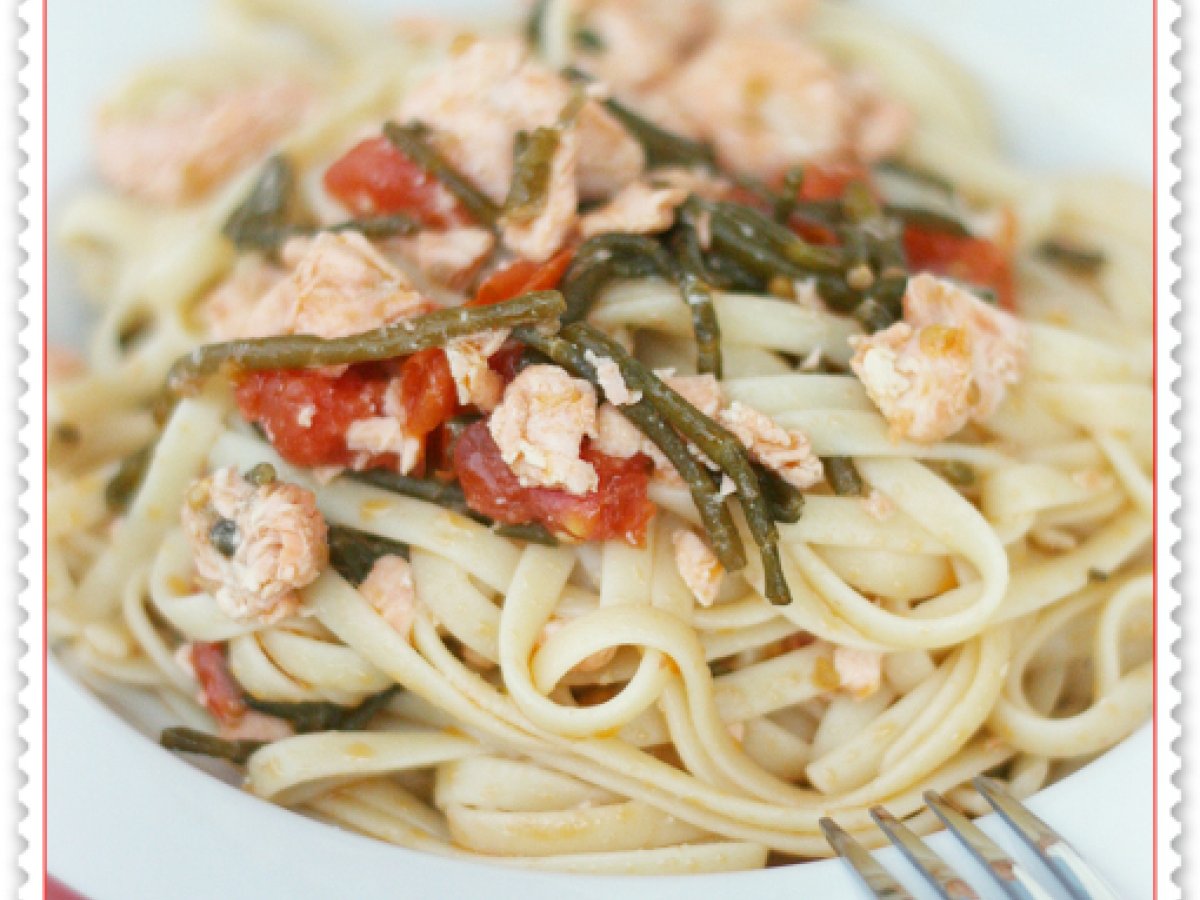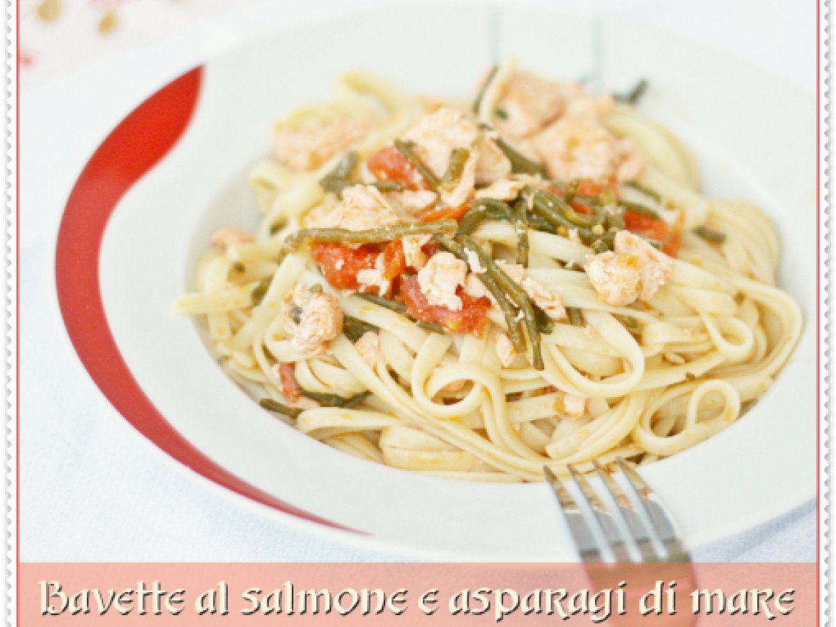 Bavette al salmone e asparagi di mare vota adesso PrecedenteProssimo Portata principalefacile35 min Invia questa ricetta ad un amico Stampa la ricetta Contatta l'autore della Ricetta Pubblica la foto di questa ricetta Ingredienti 3 200 g di bavette/linguine 1 trancio di salmone grande 120 gr di asparagi di mare una decina di pomodori datterini o ciliegini olio evo vino bianco 1 spicchio d’aglio sale