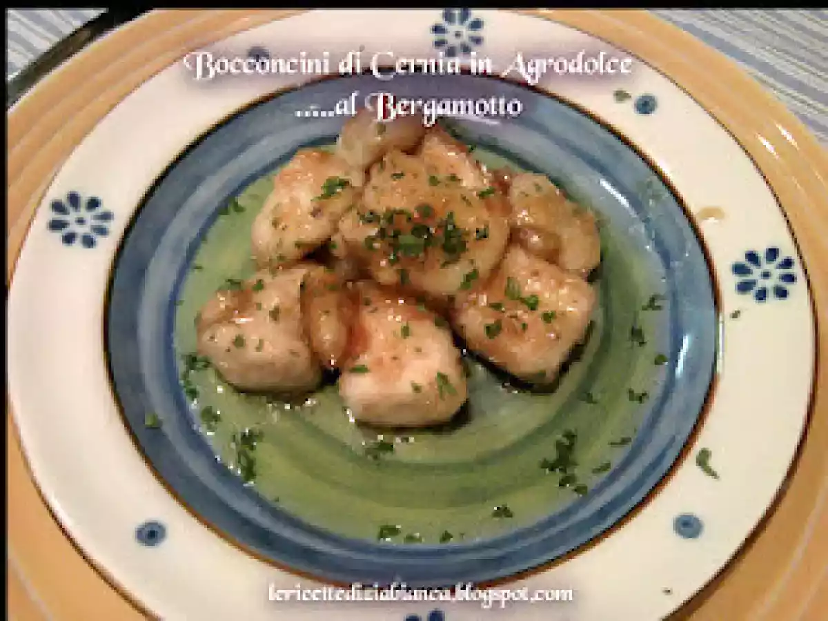 Bocconcini di cernia in agrodolce al bergamotto PrecedenteProssimo Portata principalemedia35 min Invia questa ricetta ad un amico Stampa la ricetta Contatta l'autore della Ricetta Pubblica la foto di questa ricetta Un "profumatissimo" modo di gustare la Cernia! Ingredienti 2 400g Cernia (2 tranci della parte più interna) farina sale olio evo burro Sciroppo di Bergamotto prezzemolo