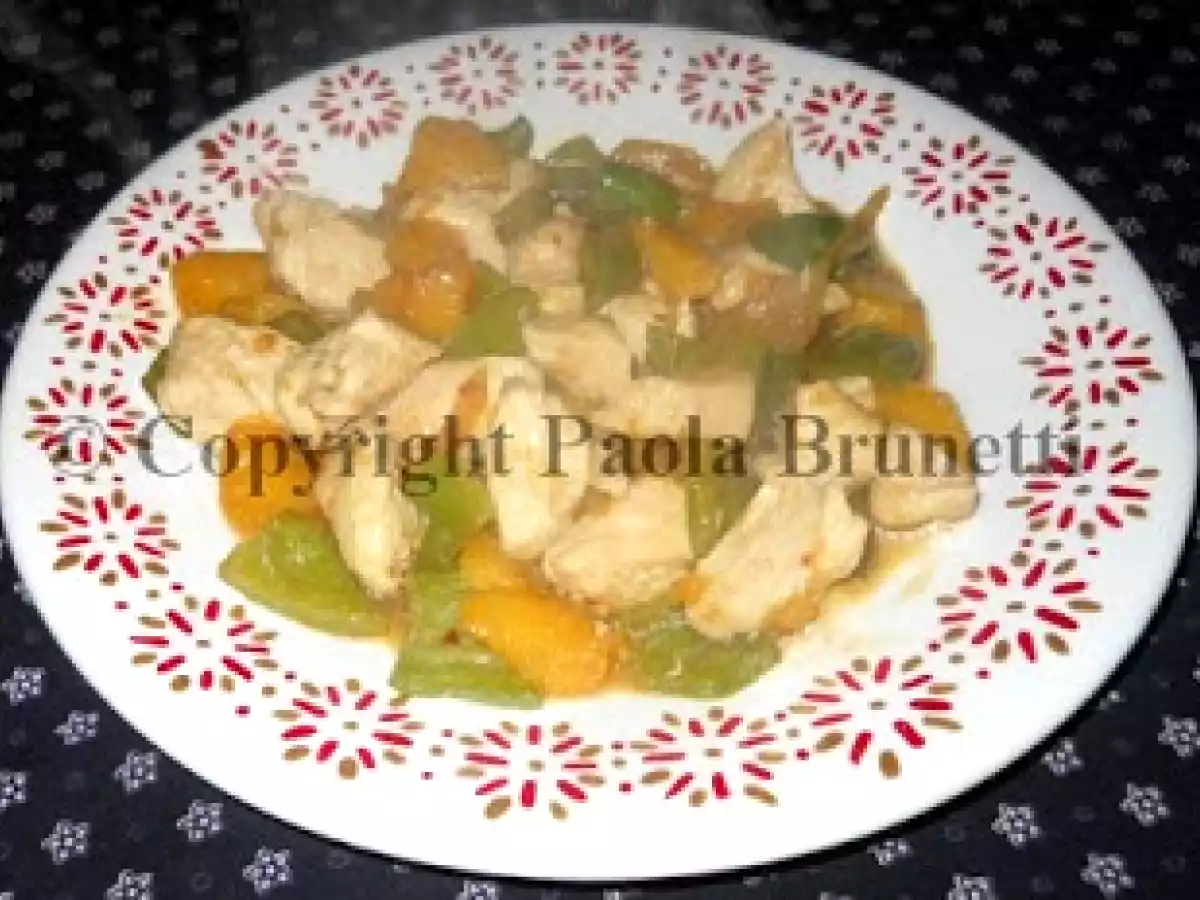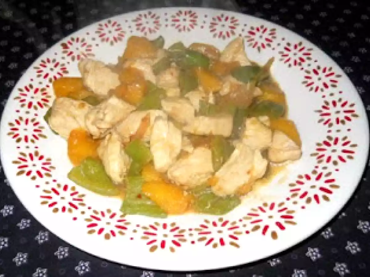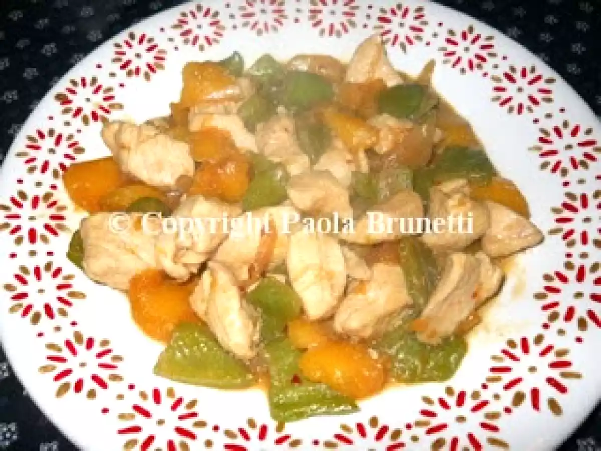 Bocconcini di pollo con pesche e peperoni PrecedenteProssimo Portata principalefacile30 min212 Kcal Invia questa ricetta ad un amico Stampa la ricetta Contatta l'autore della Ricetta Pubblica la foto di questa ricetta Ingredienti 4 200 g di bocconcini di pollo 100 g di pesche fresche 1 peperone verde 1 peperoncino fresco 1 cipolla 1 porro 3 cucchiai di salsa di soia olio extravergine di oliva Costo stimato: 3.27Euros€ (0.82€/Porzioni)