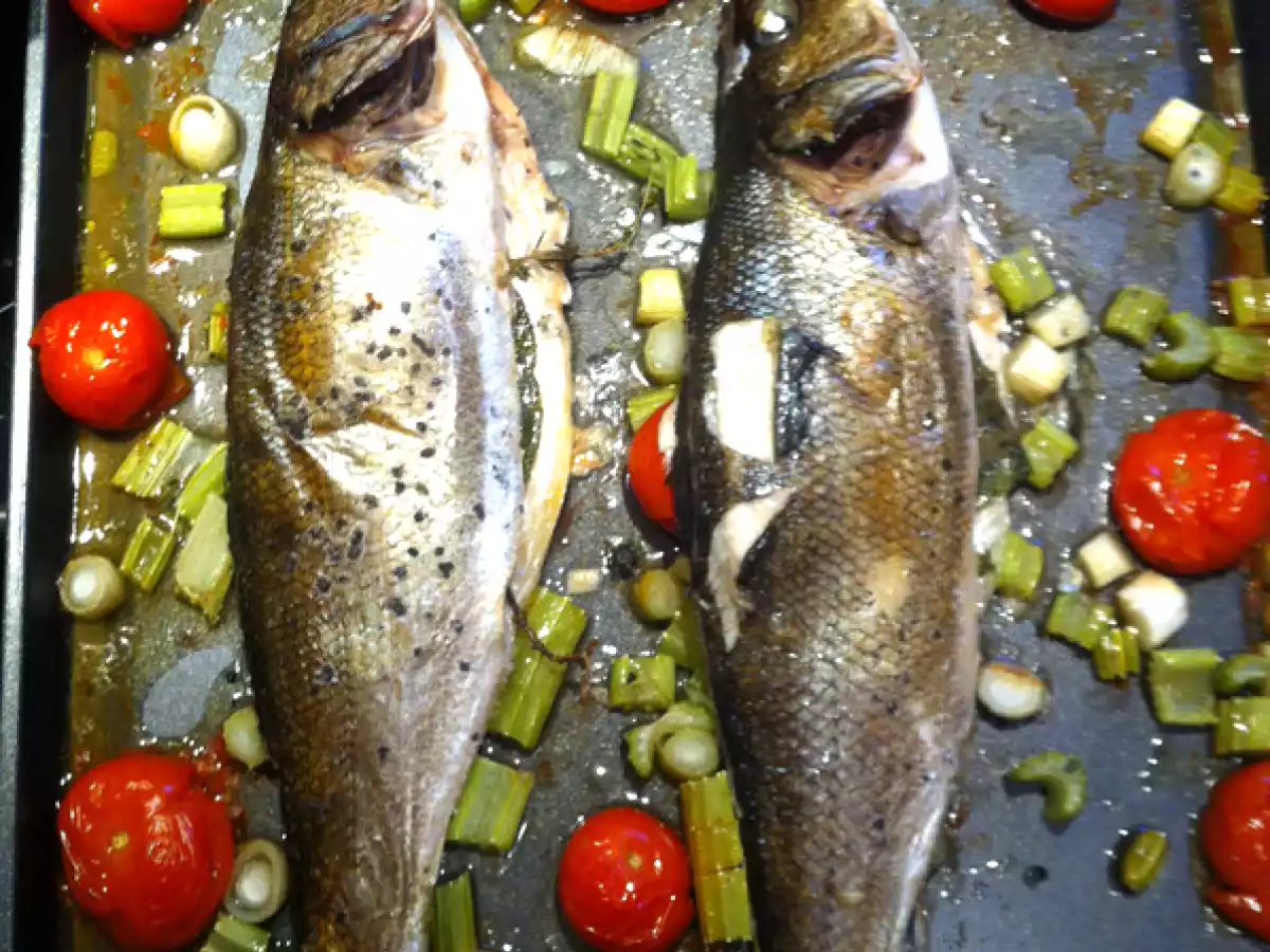 Branzino al forno con pomodorini, sedano e cipollotti, ripieni di erbe aromatiche