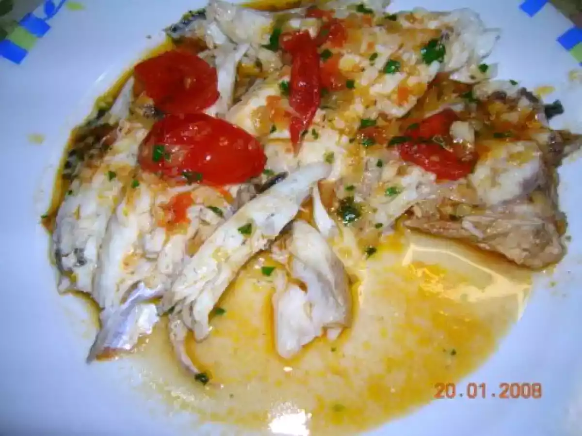 Branzino all?acqua pazza vota adesso PrecedenteProssimo Portata principalefacile50 min Invia questa ricetta ad un amico Stampa la ricetta Contatta l'autore della Ricetta Pubblica la foto di questa ricetta Ingredienti 2 1 branzino da circa 700/800 gr 300/400 gr di pomodori pachino 1 scalogno 2 spicchi di aglio sale pepe prezzemolo Olio extravergine di oliva q. b. 1 bicchiere di vino bianco