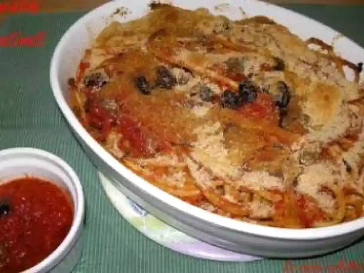 Bucatini gratinati Portata principalefacile1 h 10 m Invia questa ricetta ad un amico Stampa la ricetta Contatta l'autore della Ricetta Pubblica la foto di questa ricetta Ingredienti 4 250 g. di bucatini, 400 g. di polpa di pomodoro, 2,5 cucchiai di olive nere, possibilmente di Gaeta, una manciata di capperi sotto sale, 1 aglio, olio extravergine di oliva, pan grattato, prezzemolo, sale.