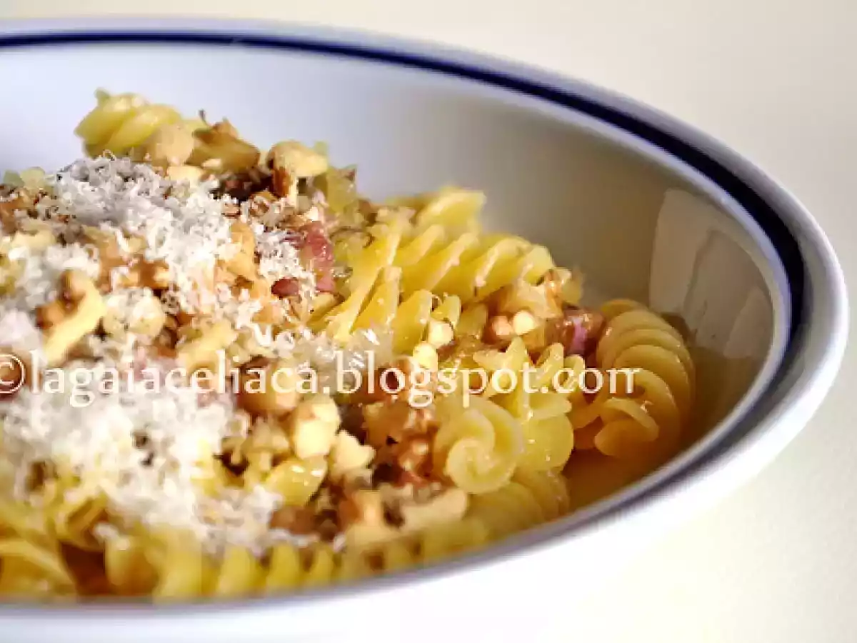 Butta la pasta che ti passa Portata principalefacile40 min Invia questa ricetta ad un amico Stampa la ricetta Contatta l'autore della Ricetta Pubblica la foto di questa ricetta Ingredienti 3 350 g di pasta corta al mais 1 cespo di radicchio variegato di Castelfranco pancetta tesa 150 g parmigiano reggiano noci sbucciate, un paio di manciate olio extravergine di oliva sale pepe