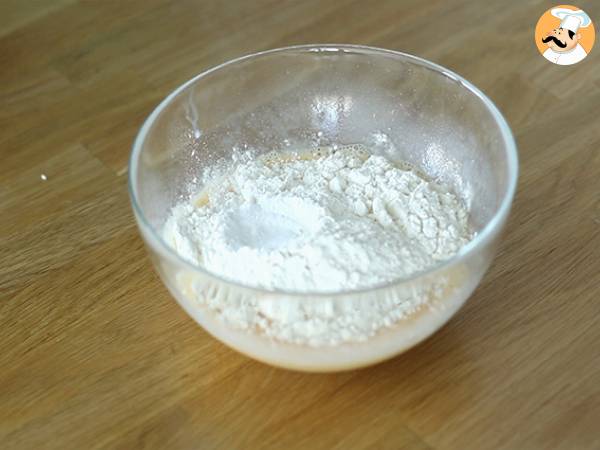 In una ciotola mescolate le uova con il latte. Aggiungete la farina, il lievito, sale e pepe. Quindi mescolate per bene.