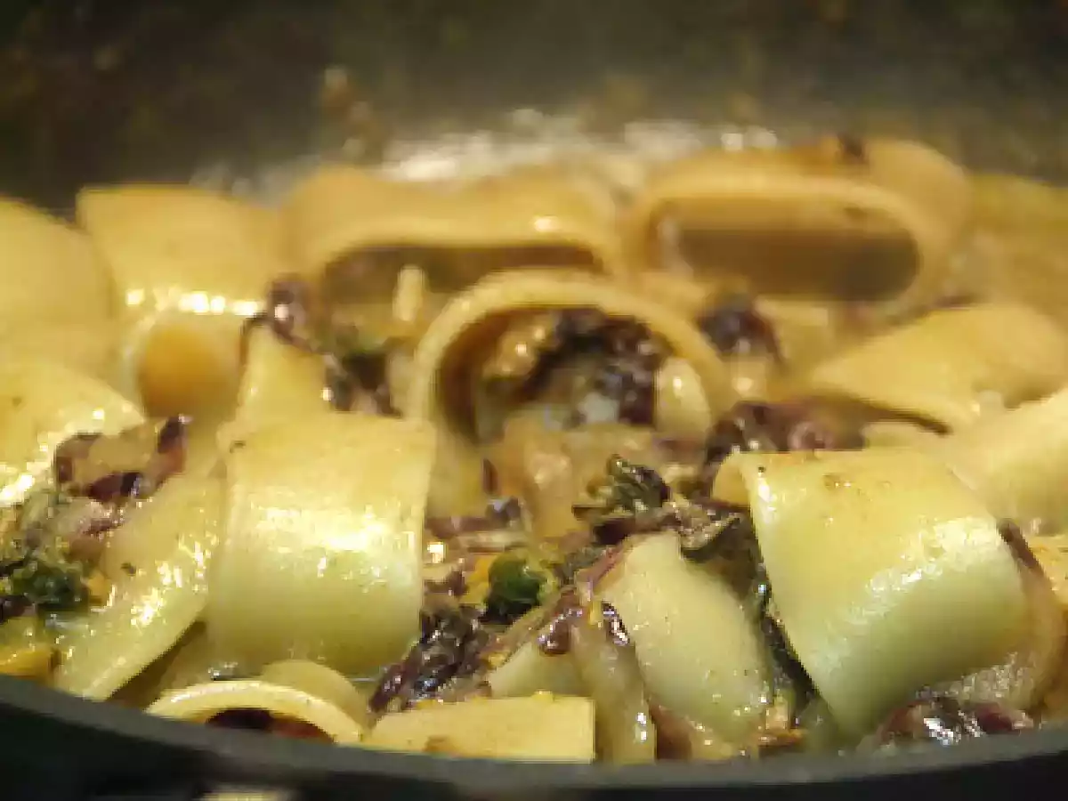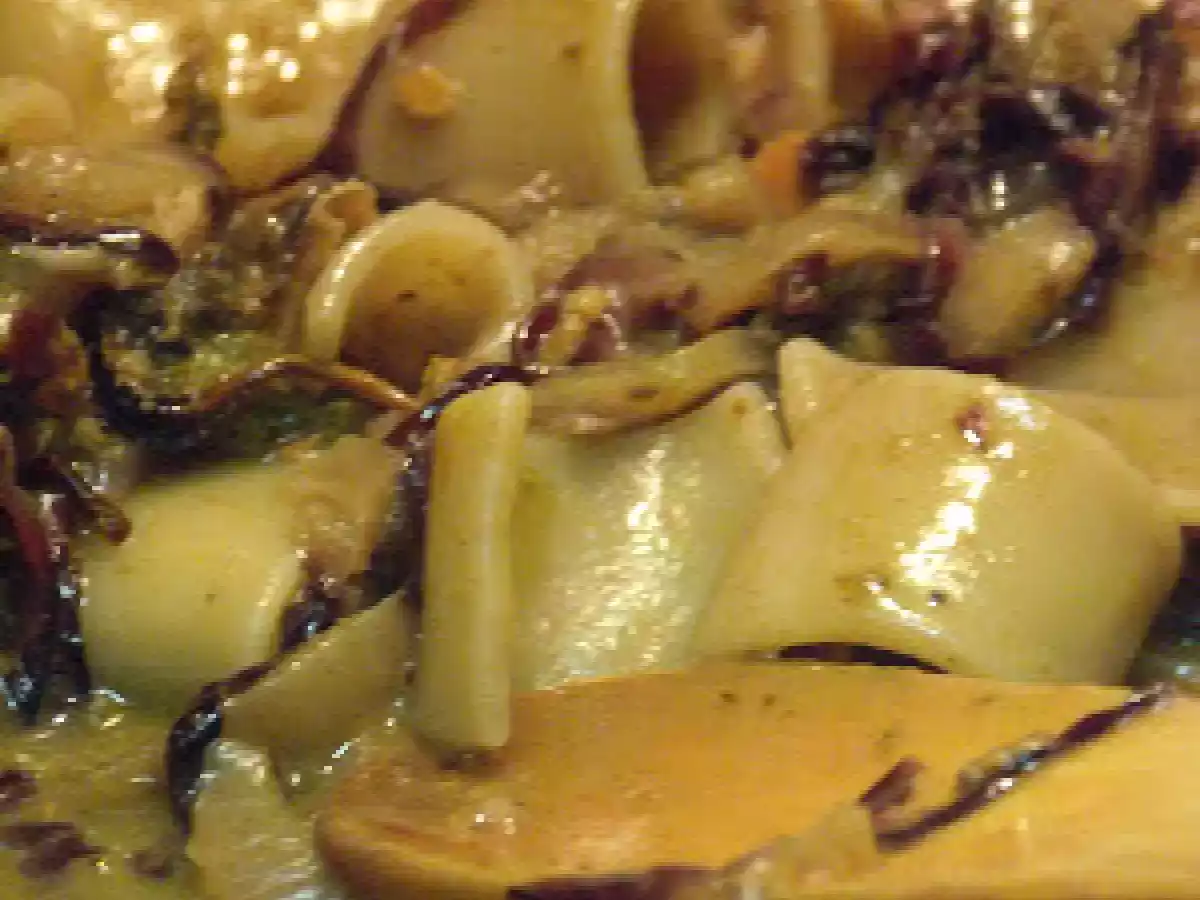 Calamarata ai muscoli (cozze), acciughe e radicchio trevisano PrecedenteProssimo Portata principalefacile45 min Invia questa ricetta ad un amico Stampa la ricetta Contatta l'autore della Ricetta Pubblica la foto di questa ricetta Ingredienti 6 80-90 g pasta tipo "calamarata" mezzo barattolino di muscoli sgusciati, al naturale 4 foglie di radicchio trevisano lungo, tagliate a striscioline sottili 2 filetti d'acciuga salati e sott'olio 2 spicchi d'aglio schiacciati vino bianco q.b. olio extravergine di oliva q.b.
