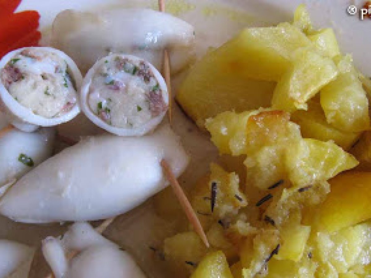 Calamari ripieni al forno Portata principalefacile55 min457 Kcal Invia questa ricetta ad un amico Stampa la ricetta Contatta l'autore della Ricetta Pubblica la foto di questa ricetta Ingredienti 2 400 g di calamari 2 filetti di acciuga 40 g di mollica di pane un mazzetto di prezzemolo poco vino bianco olio sale Costo stimato: 7.12Euros€ (3.56€/Porzioni)