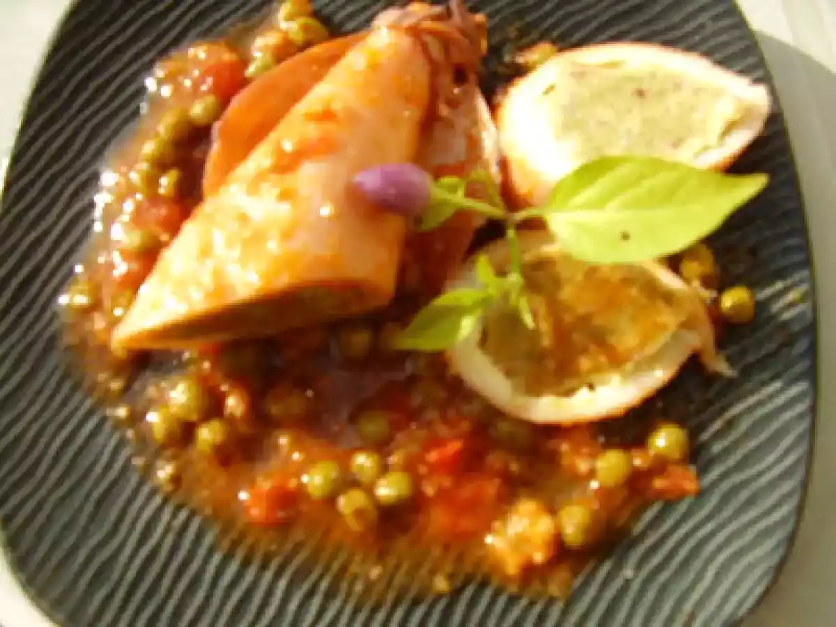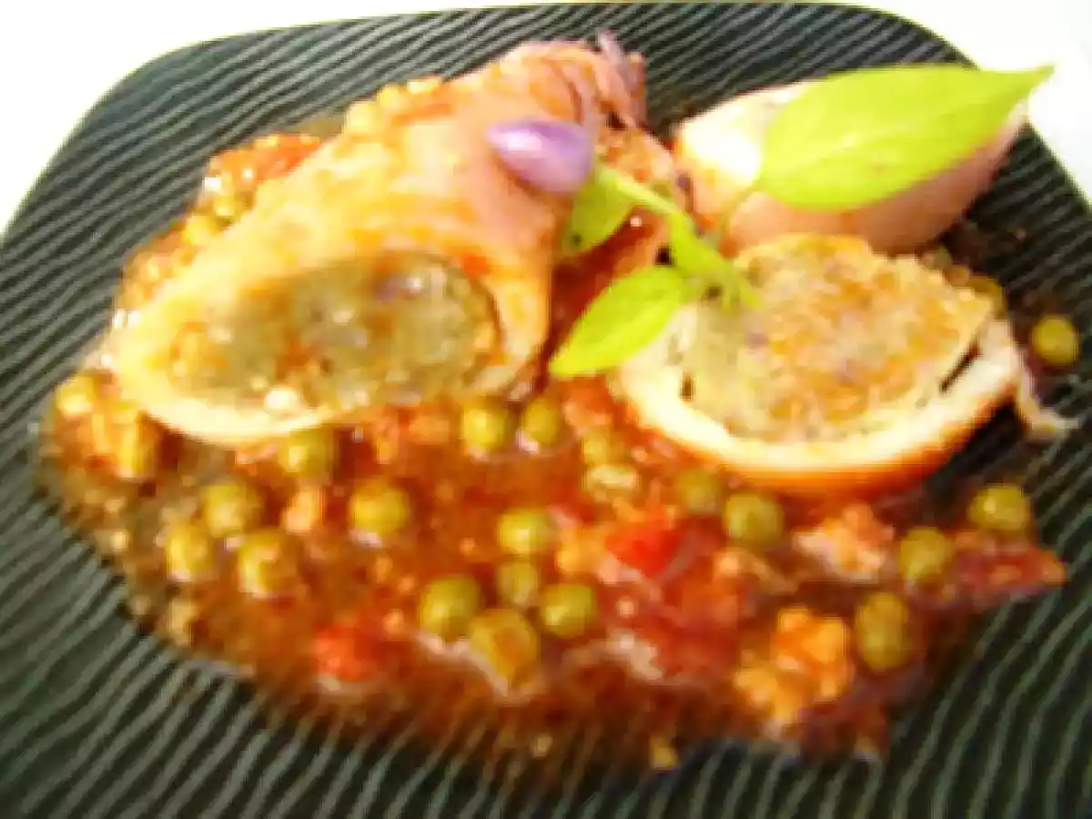 Calamari ripieni con sughetto ai piselli PrecedenteProssimo Portata principalefacile55 min Invia questa ricetta ad un amico Stampa la ricetta Contatta l'autore della Ricetta Pubblica la foto di questa ricetta Ingredienti 9 1) 900 g calamari freschi 250 g pisellini 40 g pane grattugiato 1 uovo Aglio prezzemolo sale q.b. e in sintonia con il vostro gusto. 2) Per il sugo: 400 g Polpa di pomodoro Olio-aglio-peperoncino q.b.
