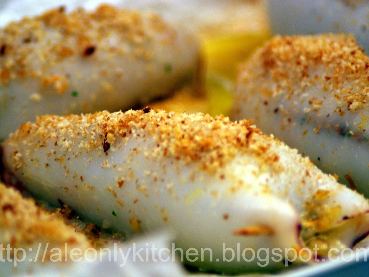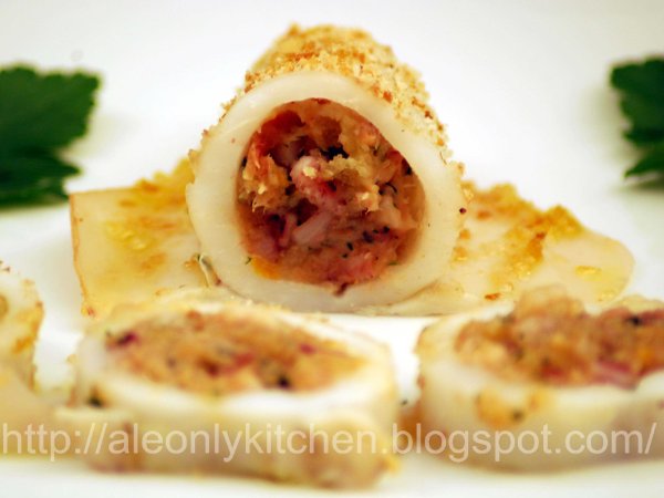 Calamari ripieni PrecedenteProssimo Portata principalemedia50 min Invia questa ricetta ad un amico Stampa la ricetta Contatta l'autore della Ricetta Pubblica la foto di questa ricetta Ingredienti 3 Quando preparo questo deliziosa ricetta, la cui fonte è Gino L. di Pistoia, che scriveva sul forum della Cucina Italiana, con la maggior parte degli ingredienti vado "a occhio", non li ho mai pesati, ma dosati in base al mio gusto... Perciò mi dispiace non poter essere più precisa al riguardo, ma seguite anche voi il vostro gusto e il buon senso, e non vi sbaglierete! E' però fondamentale utilizzare dei calamari freschissimi e possibilmente mediterranei! Ingredienti per 3 persone 6 calamari medi (12-15 cm) freschi! mollica di pane q.b. una piccola manciata di Parmigiano grattugiato un cucchiaino di prezzemolo tritato uno spicchio d'aglio (facoltativo) sale e pepe nero q.b. olio exv d'oliva tonno sott'olio (quello buono tipo Callipo o simili) oppure pesce spada sott'olio un pizzico di scorza di limone bio grattugiata un pizzico di scorza di arancia bio grattugiata pangrattato 50 ml di vino bianco secco burro