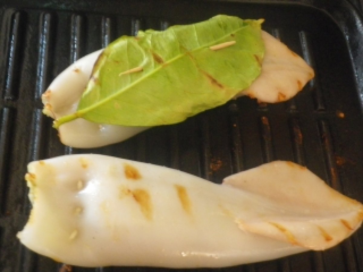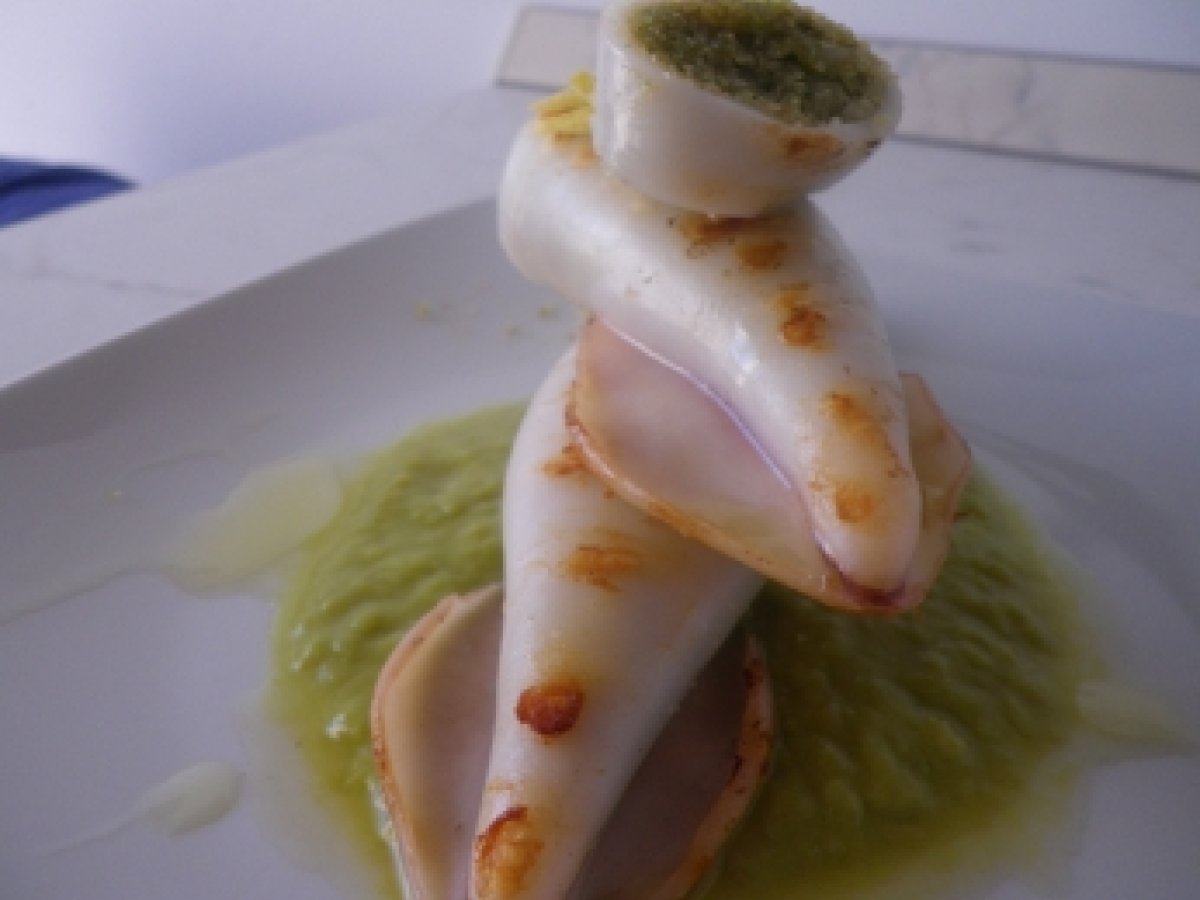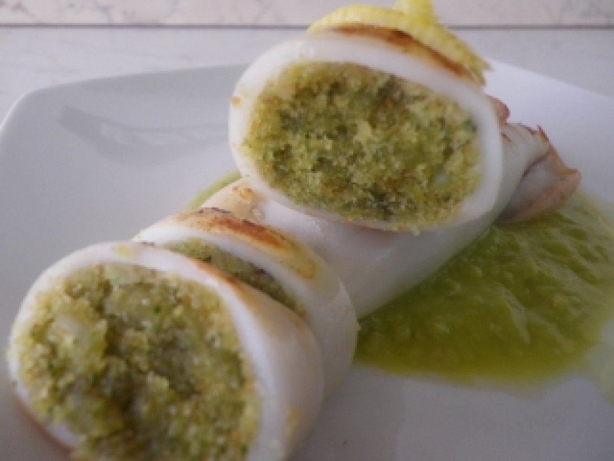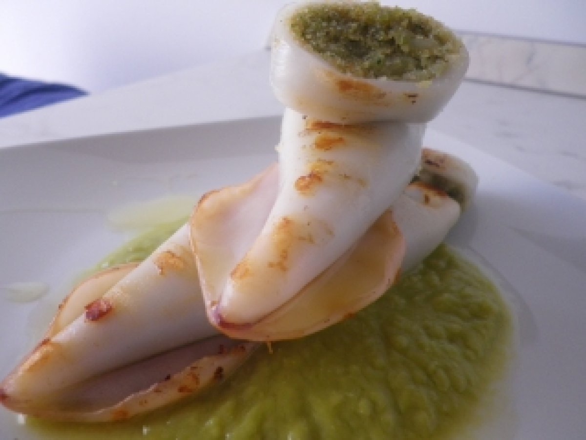 Calamari ripieni grigliati su crema di piselli e premio vota adesso PrecedenteProssimo Portata principalefacile40 min Invia questa ricetta ad un amico Stampa la ricetta Contatta l'autore della Ricetta Pubblica la foto di questa ricetta Ingredienti 2 due calamari di medie dimensioni 60/70 g pangrattato uno spicchio d'aglio due cucchiai di parmigiano grattugiato un cucchiaino di capperi un cucchiaino pieno di pinoli 5 cucchiai d'olio extravergine d'oliva prezzemolo sale e pepe