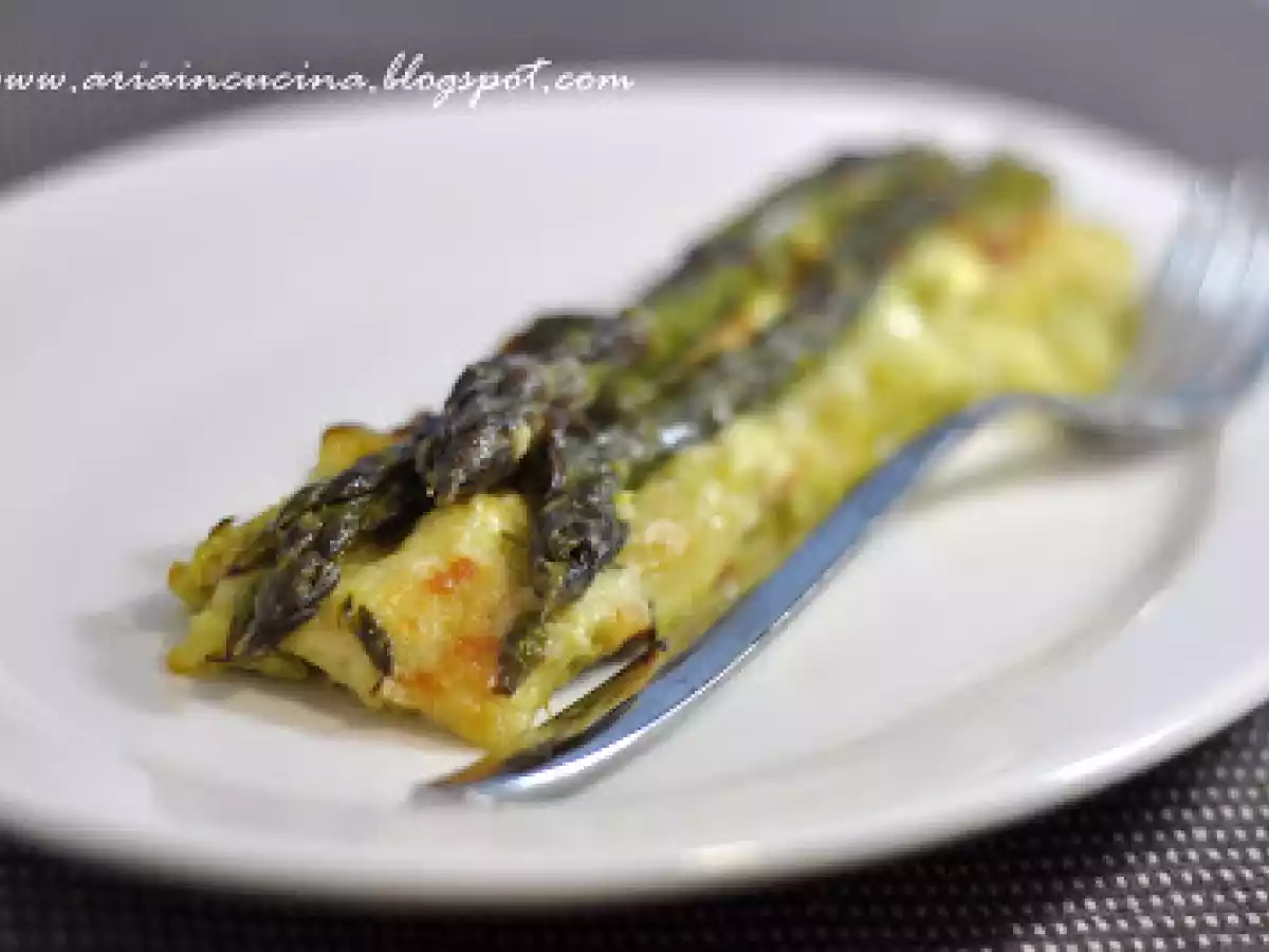 Cannelloni agli asparagi e montasio in salsa mornay vota adesso Portata principalefacile30 min Invia questa ricetta ad un amico Stampa la ricetta Contatta l'autore della Ricetta Pubblica la foto di questa ricetta Ingredienti 4 16 fogli di pasta fresca 400 gr di asparagi 200 gr di montasio burro 500 gr di besciamella 60 gr di parmigian0 2 tuorli 2 dl di panna