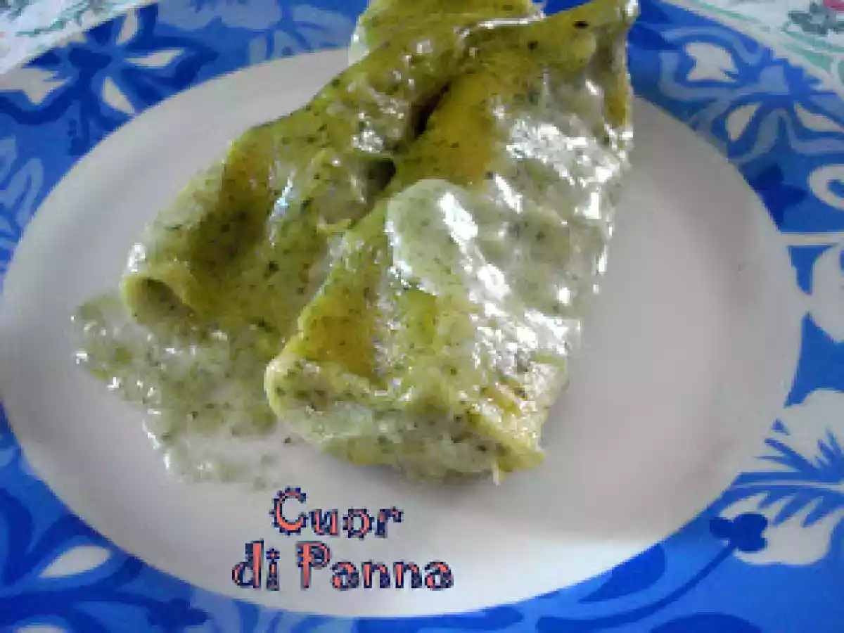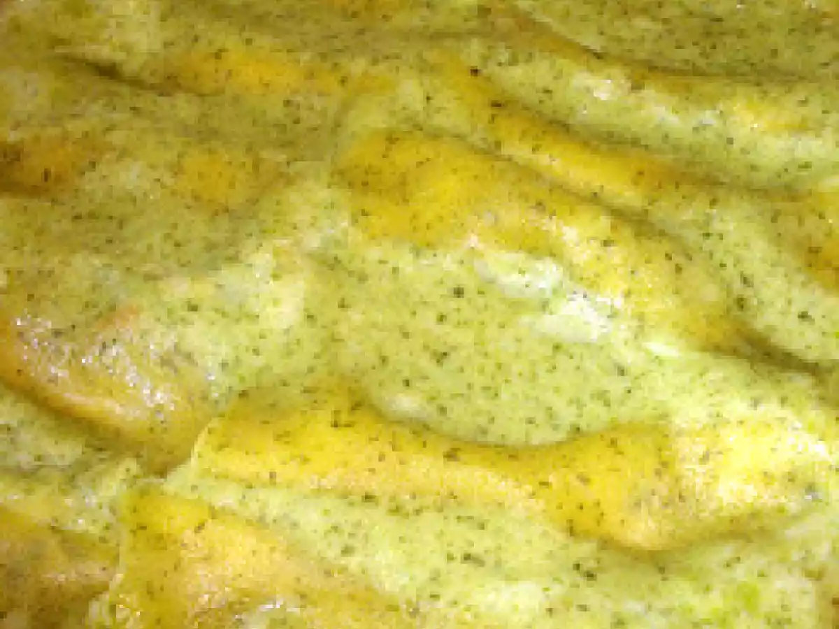 Cannelloni ai formaggi e cotto con salsa al pesto vota adesso PrecedenteProssimo Portata principalefacile50 min931 Kcal Invia questa ricetta ad un amico Stampa la ricetta Contatta l'autore della Ricetta Pubblica la foto di questa ricetta Ingredienti 2 Per il ripieno: 200 gr di ricotta 100 gr di mozzarella 2 uova 50 gr di grana grattugiata 100 gr di prosciutto cotto Prezzemolo tritato fine Basilico tritato fine Per la salsa al pesto: Besciamella 500 ml di latte 1 cucchiaio e mezzo di farina 1 noce di burro 1 pizzico di pepe nero 1 pizzico di noce moscata