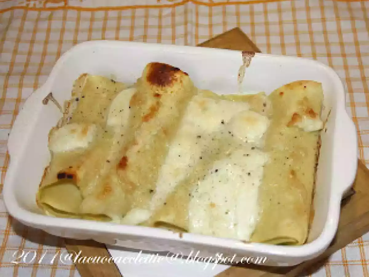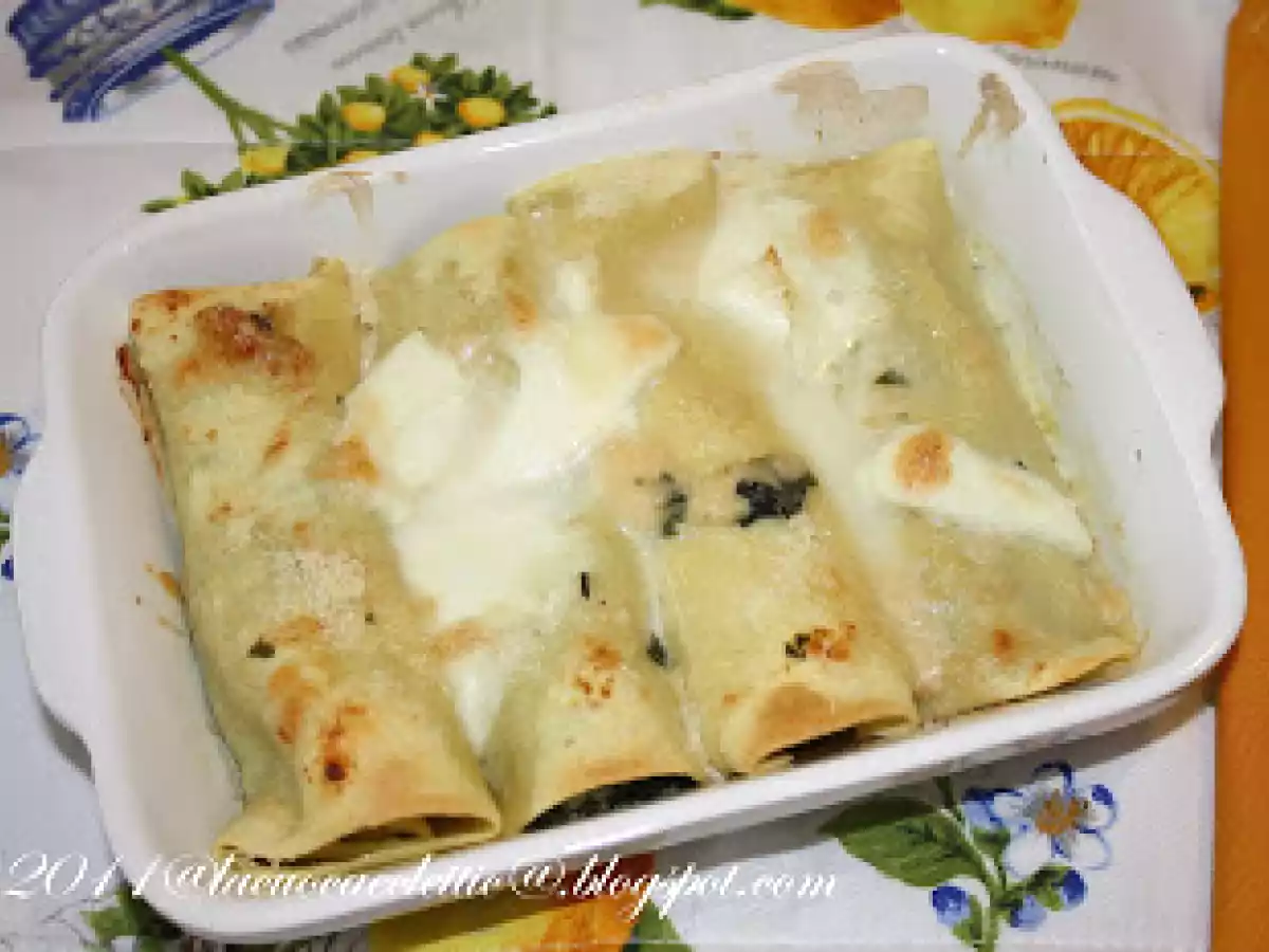 Cannelloni con erbette e ricotta PrecedenteProssimo Portata principalefacile45 min Invia questa ricetta ad un amico Stampa la ricetta Contatta l'autore della Ricetta Pubblica la foto di questa ricetta Ingredienti 2 per la pasta : 160 g di farina 00 4 g di semola 2 uova per la farcitura : 700 g di erbette 250 g di ricotta di pecora 1 cucchiaio di pinoli parmigiano reggiano olio extravergine di oliva aglio noce moscata per la gratinatura : 100 g di mozzarella di bufala parmigiano reggiano latte noce moscata pepe