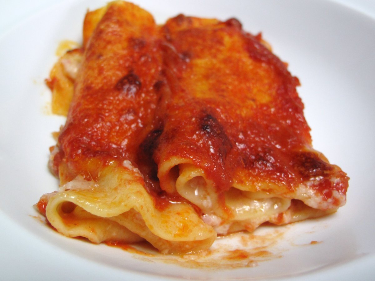 Dei cannelloni con ripieno di gustoso prosciutto cotto, fontina e morbida besciamella coperti da pomodoro leggero e una spolverata di parmigiano grattugiato