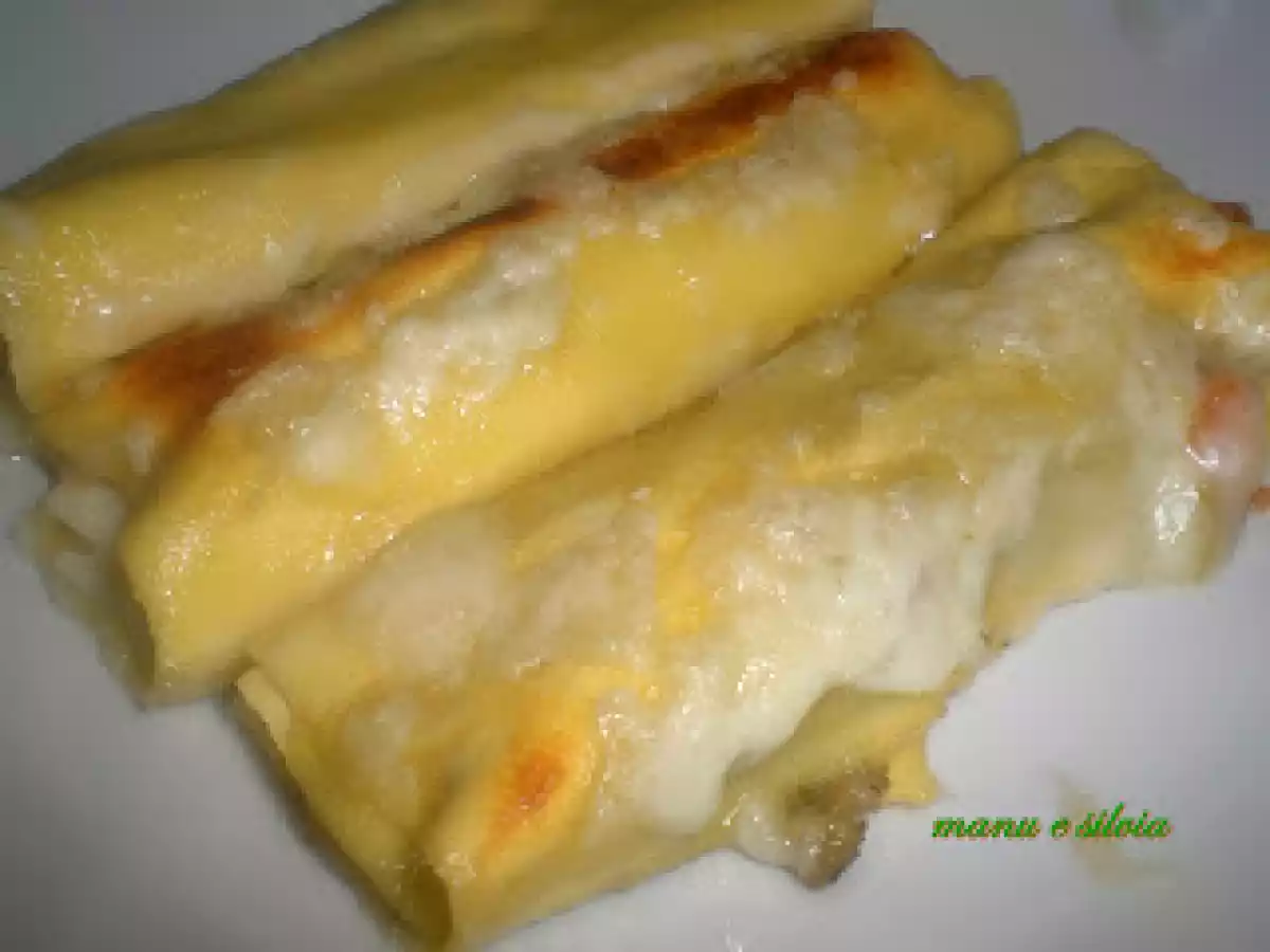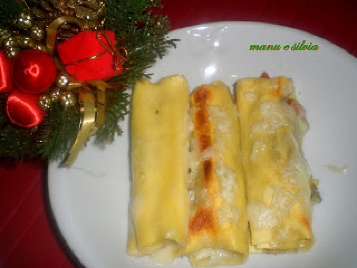 Cannelloni natalizi vota adesso PrecedenteProssimo Portata principalefacile35 min1181 Kcal Invia questa ricetta ad un amico Stampa la ricetta Contatta l'autore della Ricetta Pubblica la foto di questa ricetta Ingredienti 4 1) Per la pasta all?uovo: 400 g semola rimacinata di grano duro 2 uova acqua sale 2) Per il ripieno: 500 g broccolo 2 carote 500 ml besciamella gherigli di noce 20 g pecorino dolce sardo sale, pepe bianco
