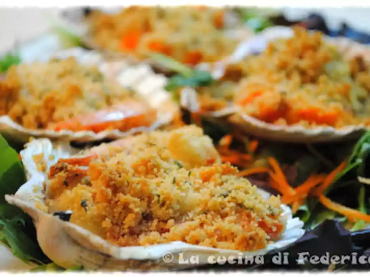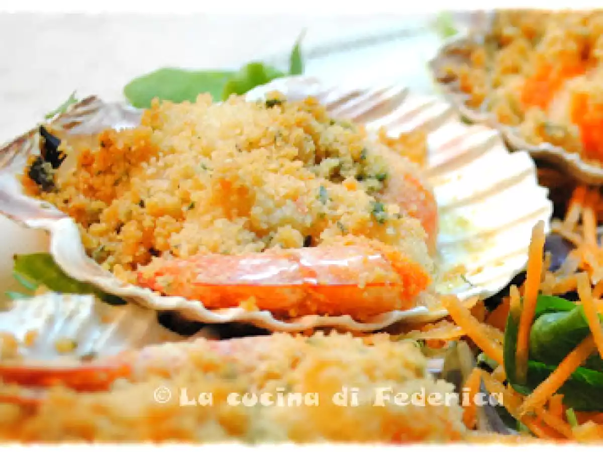 Capesante e gamberoni gratinati PrecedenteProssimo Portata principalefacile40 min Invia questa ricetta ad un amico Stampa la ricetta Contatta l'autore della Ricetta Pubblica la foto di questa ricetta Ingredienti 2 4 capesante 4 gamberoni Parmigiano grattugiato Impan Ariosto pepe prezzemolo tritato olio extra vergine d'oliva
