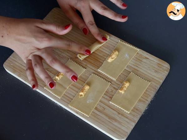 Piegate due volte la pasta attorno la farcitura (sul lato lungo) e premete su entrambi i bordi (proprio accanto alla farcitura) per chiudere la caramella. Inumidite la pasta se lo ritenete necessario.