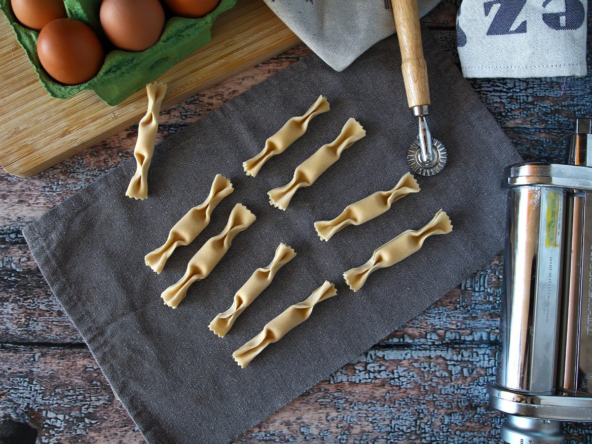 Potete utilizzare qualsiasi farina di grano ma sarebbe meglio scegliere la farina 00. Il motivo è che questa farina contiene molto glutine che non farà lacerare la pasta al momento della lavorazione.