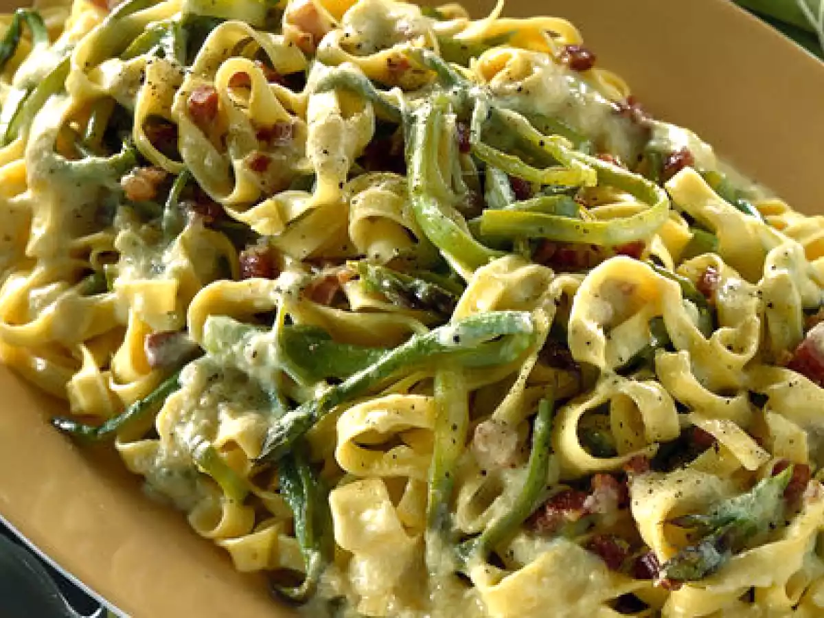 Carbonara di asparagi Portata principalemedia45 min426 Kcal Invia questa ricetta ad un amico Stampa la ricetta Contatta l'autore della Ricetta Pubblica la foto di questa ricetta Carbonara di asparagi Ingredienti 6 400 g di vermicelli 4 tuorli 250 g di guanciale 250 g di asparagi selvatici 100 g di pecorino romano pepe nero sale olio extravergine d'oliva