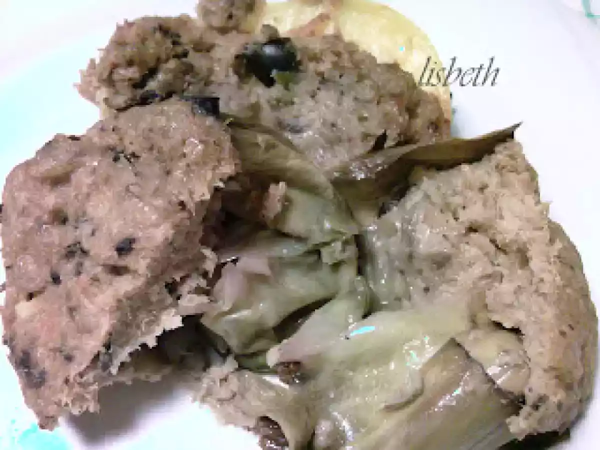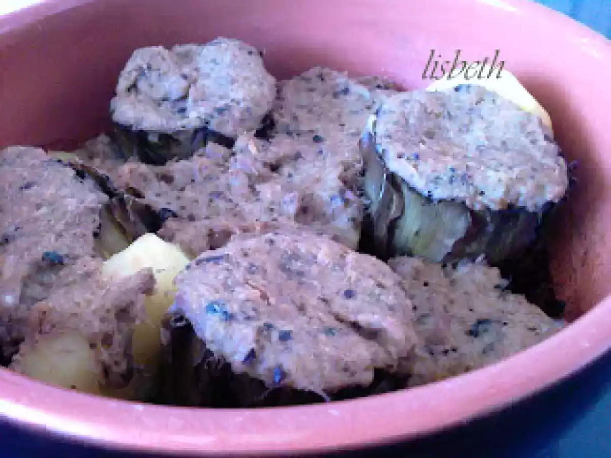 Carciofi ripieni di tonno PrecedenteProssimo Portata principalefacile1 ora Invia questa ricetta ad un amico Stampa la ricetta Contatta l'autore della Ricetta Pubblica la foto di questa ricetta Ingredienti 4 4 carciofi 1 frisella ammollata nell'acqua 150 g di tonno al naturale sgocciolato una manciata di capperi in salamoia una decina di olive nere 3-4 acciughe sott'olio una manciata di foglioline di origano fresco 1 spicchione d'aglio un paio di cucchiaiate di parmigiano grattugiato una cucchiaiata di pangrattato una grattata di scorza di limone e un cucchiaio di succo olio extravergine di oliva, sale e pepe nero macinato vino bianco, acqua
