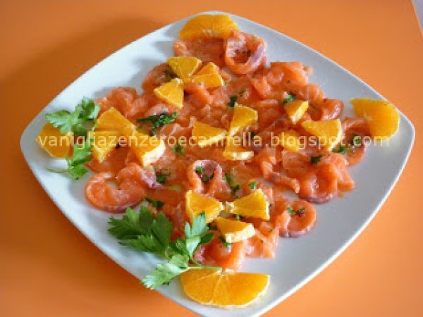 Carpaccio di salmone all'arancia vota adesso Portata principalefacile20 min Invia questa ricetta ad un amico Stampa la ricetta Contatta l'autore della Ricetta Pubblica la foto di questa ricetta Ingredienti 2 250 g di salmone fresco 2 cucchiai di olio evo sale pepe rosa prezzemolo 1 arancia la punta di un cucchiaino di wasabi mezzo limone spremuto