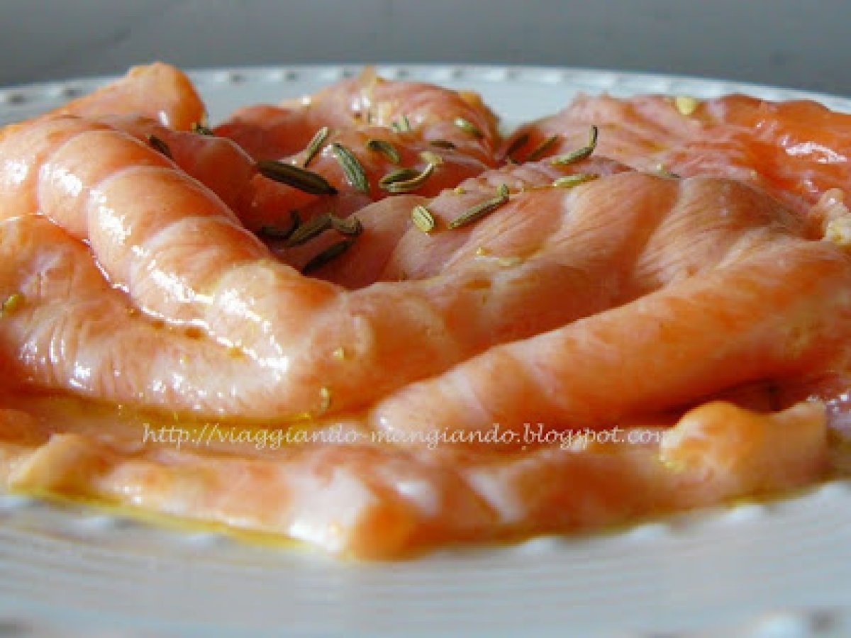 Carpaccio di salmone marinato PrecedenteProssimo Portata principalefacile45 min101 Kcal Invia questa ricetta ad un amico Stampa la ricetta Contatta l'autore della Ricetta Pubblica la foto di questa ricetta Ingredienti 4 1 salmone intero piccolo 2 limoni olio evo sale pepe bianco o rosa Costo stimato: 3.17Euros€ (0.79€/Porzioni)