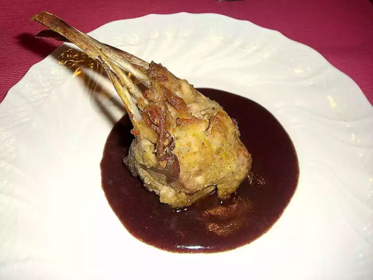Carrè di agnello in crosta d'erbe con salsa al vino rosso Portata principalefacile50 min557 Kcal Invia questa ricetta ad un amico Stampa la ricetta Contatta l'autore della Ricetta Pubblica la foto di questa ricetta Ingredienti 4 carrè di agnello privato di grasso e pelle erbe essiccate 50 g burro 80 g parmigiano grattugiato 40 g pangrattato 1 grosso uovo 1 porro 2 spicchi di aglio 700 ml vino rosso 10 g maizena 3 cucchiai di olio extravergine di oliva sale e pepe