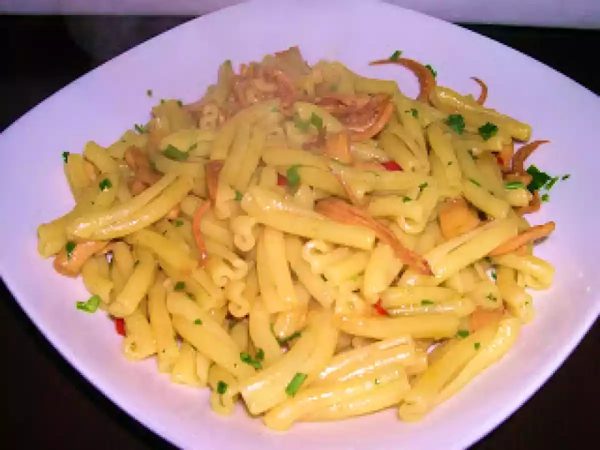 - Lessare la pasta in abbondante acqua salata, scolarla un minuto prima del fine cottura e ripassarla nel sugo, cospargere con altro prezzemolo tritato e servire.