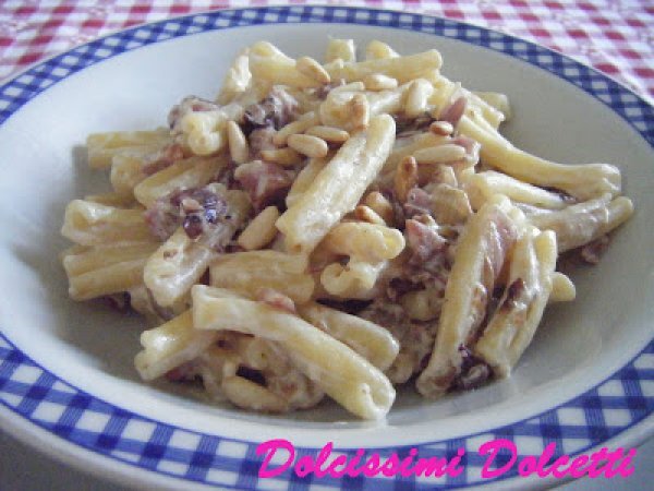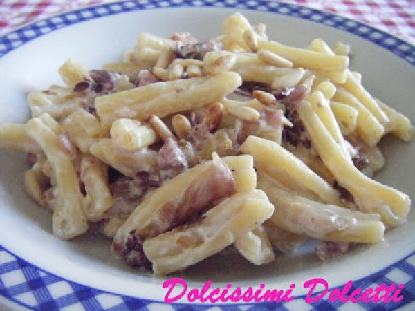 Caserecce con radicchio, speck e pinoli PrecedenteProssimo Portata principalefacile50 min Invia questa ricetta ad un amico Stampa la ricetta Contatta l'autore della Ricetta Pubblica la foto di questa ricetta Ingredienti 4 400 g di caserecce 70 g di radicchio 120 g di speck a cubetti 50 g di pinoli 1 scalogno 40 g di burro 200 ml di panna pepe nero sale