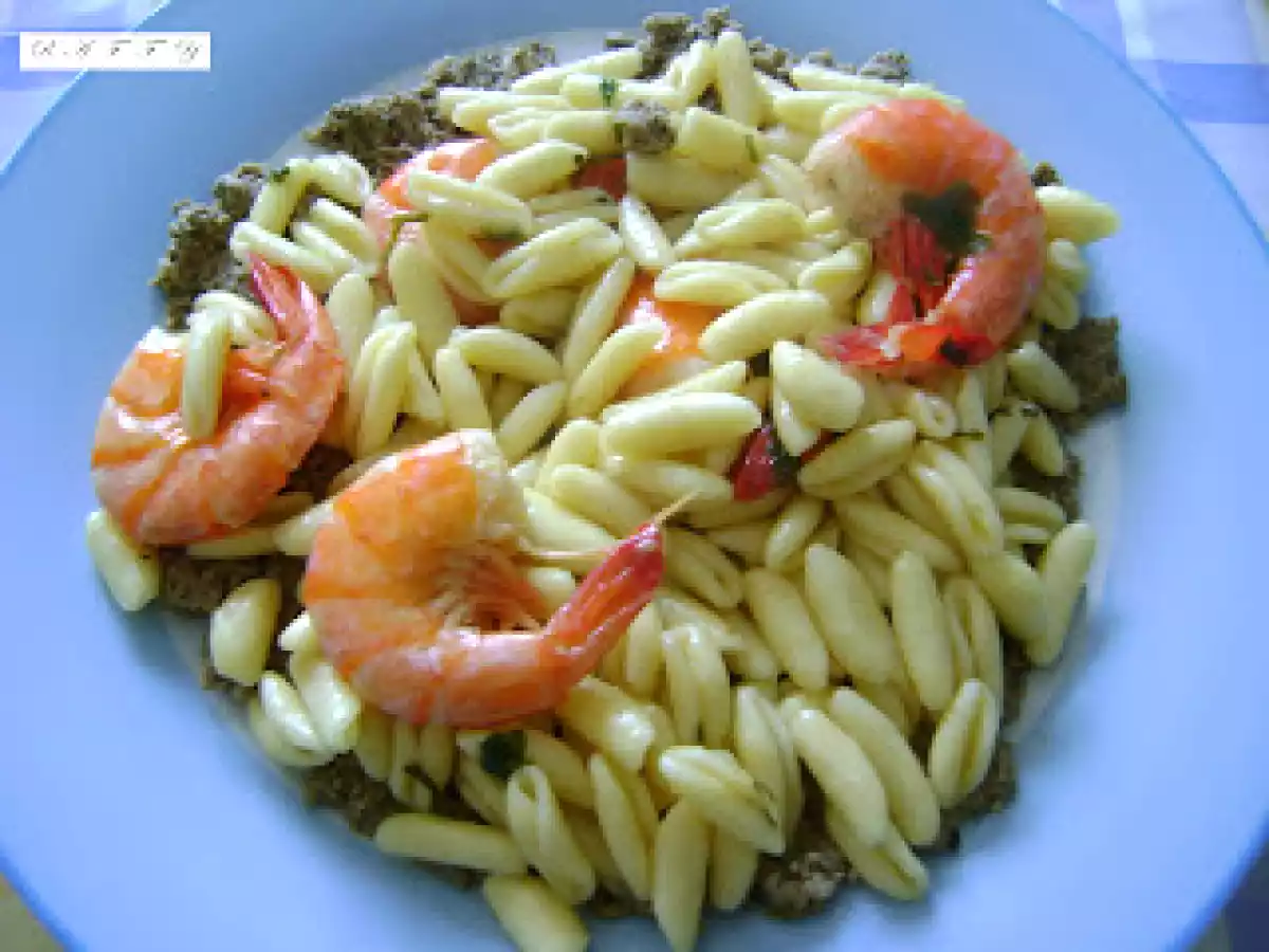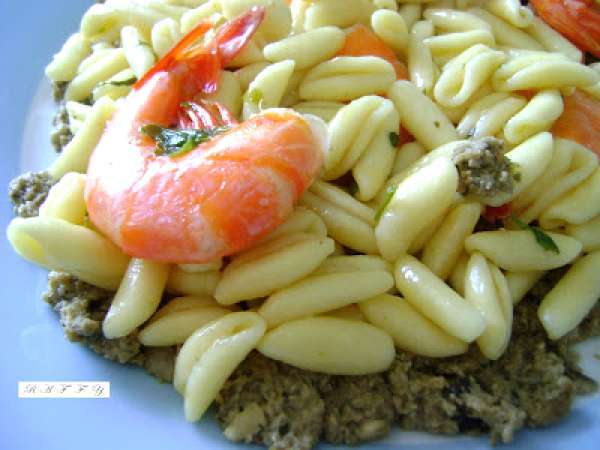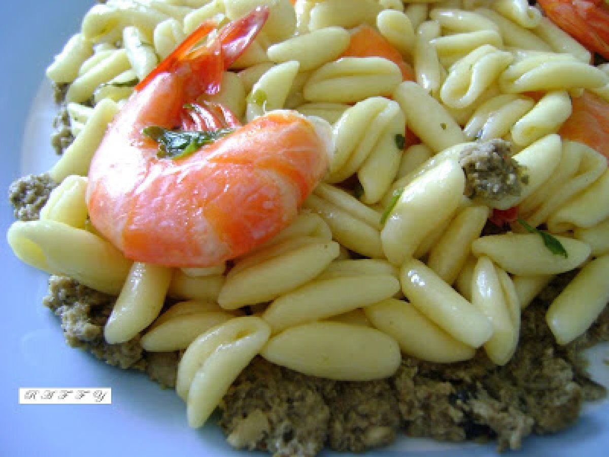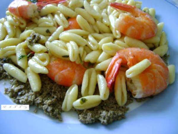 Cavatelli ai gamberi su pesto di melanzane e menta PrecedenteProssimo Portata principalefacile48 min Invia questa ricetta ad un amico Stampa la ricetta Contatta l'autore della Ricetta Pubblica la foto di questa ricetta Ingredienti 2 10-12 mazzancolle 1 spicchio d'aglio olio prezzemolo mezzo bicchiere di vino bianco fumetto 220 g di cavatelli freschi 1 noce di burro Pesto di melanzane e menta: 1 melanzana medio-grande 1/2 cucchiaino d'aglio polverizzato 10 foglie di menta olio 2 cucchiai di formaggio grattuggiato sale 1 cucchiaio di pinoli