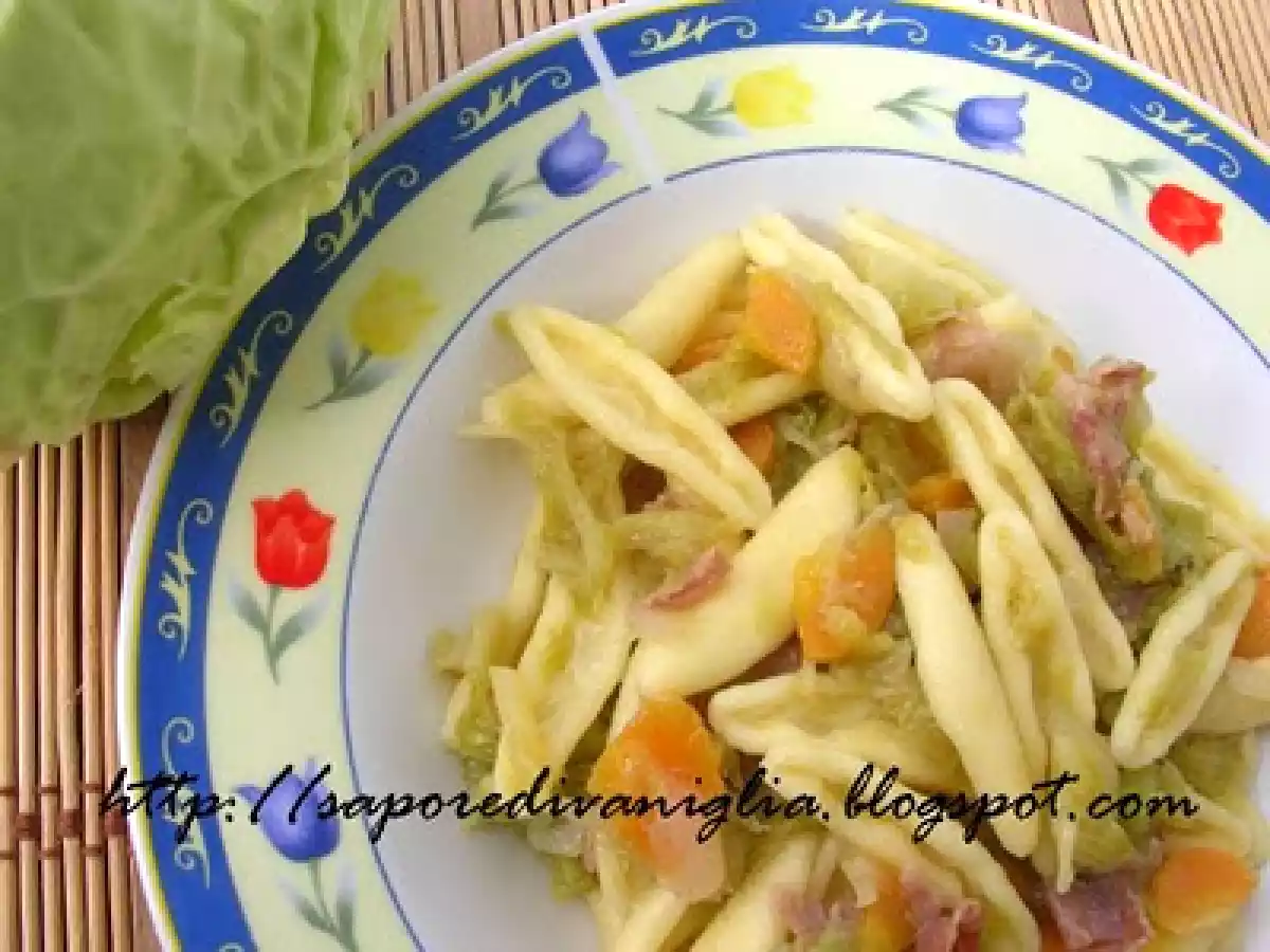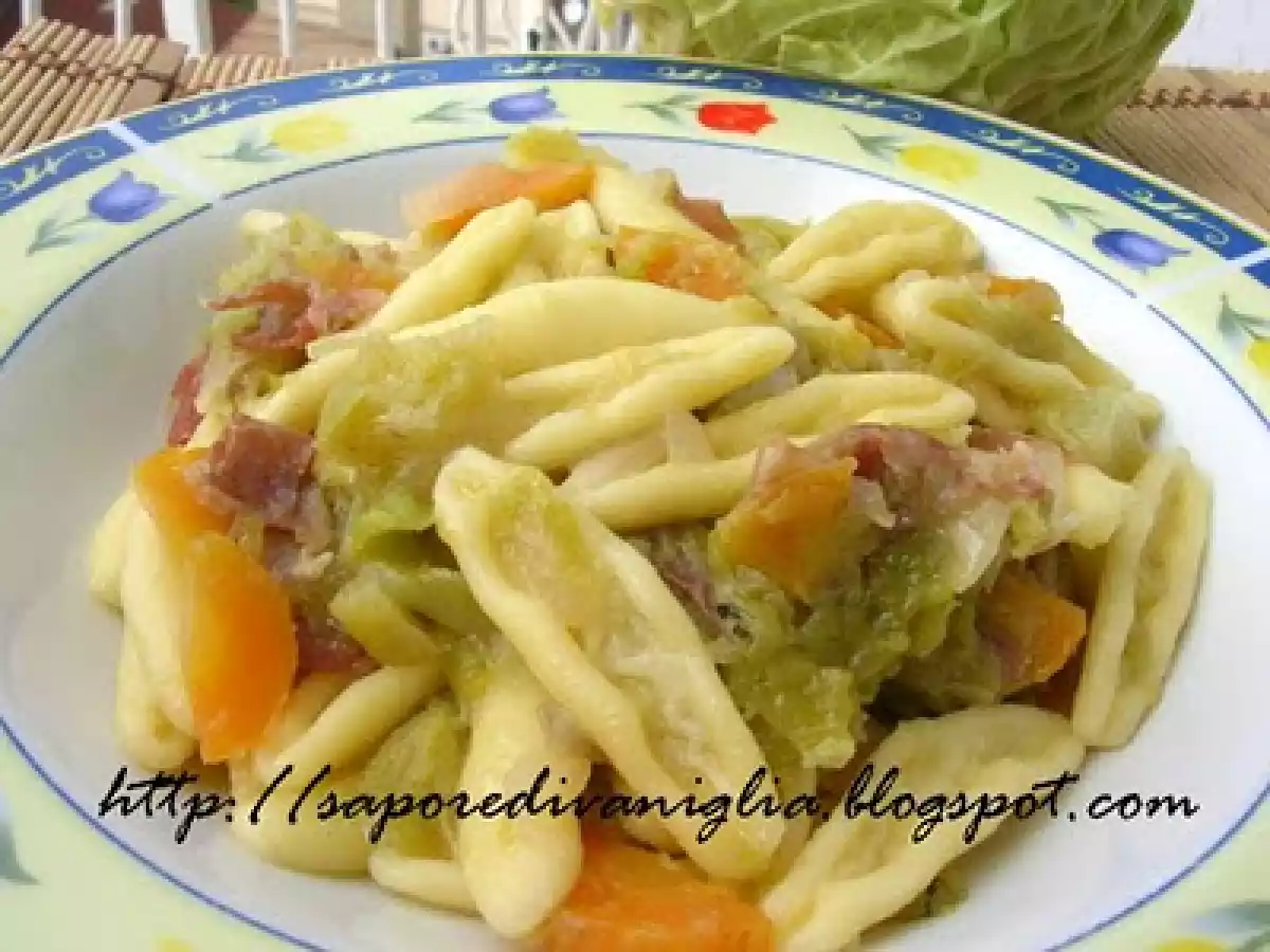 Cavatelli con verza, carote e speck vota adesso PrecedenteProssimo Portata principalefacile50 min Invia questa ricetta ad un amico Stampa la ricetta Contatta l'autore della Ricetta Pubblica la foto di questa ricetta Ingredienti 4 400 g di cavatelli 200 g di verza tagliata a strisce 2 carote 1 di cipolla media bianca tritata 4 cucchiai di olio d'oliva mezzo bicchiere di vino bianco sale e pepe 80 g speck a listarelle