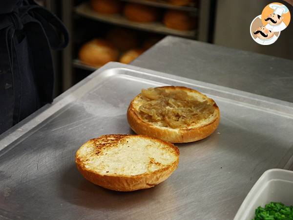 Tagliate la cipolla a fettine e rosolatela nel burro. Mescolate con cura fino a quando non sarà ben dorata. Tagliate in due il panino per hamburger e grigliate la parte interna sulla padella calda, poi adagiate la cipolla sulla base.