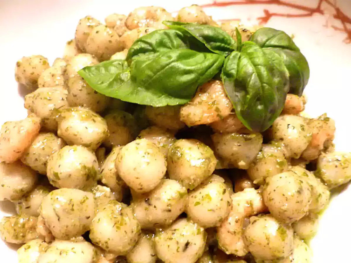 Chicche di patate agli spinaci con pesto e gamberetti