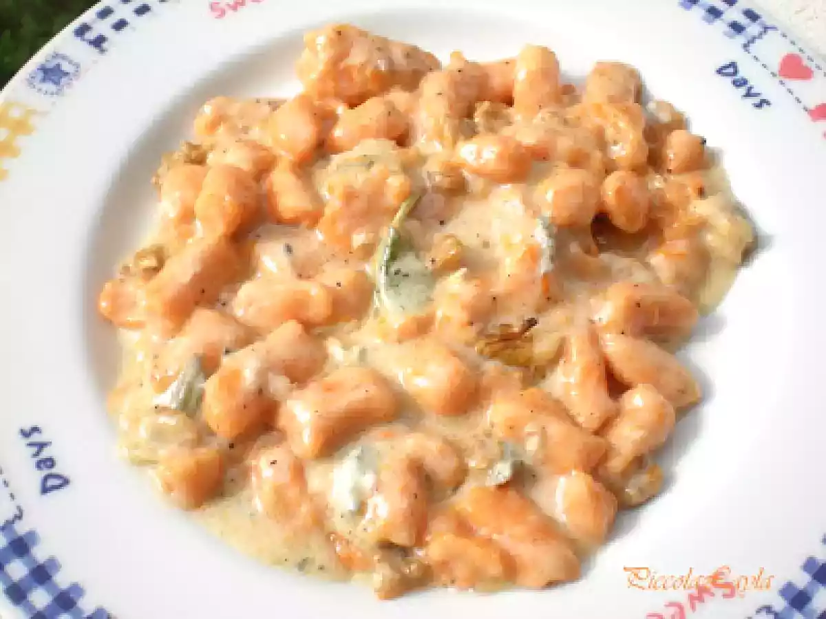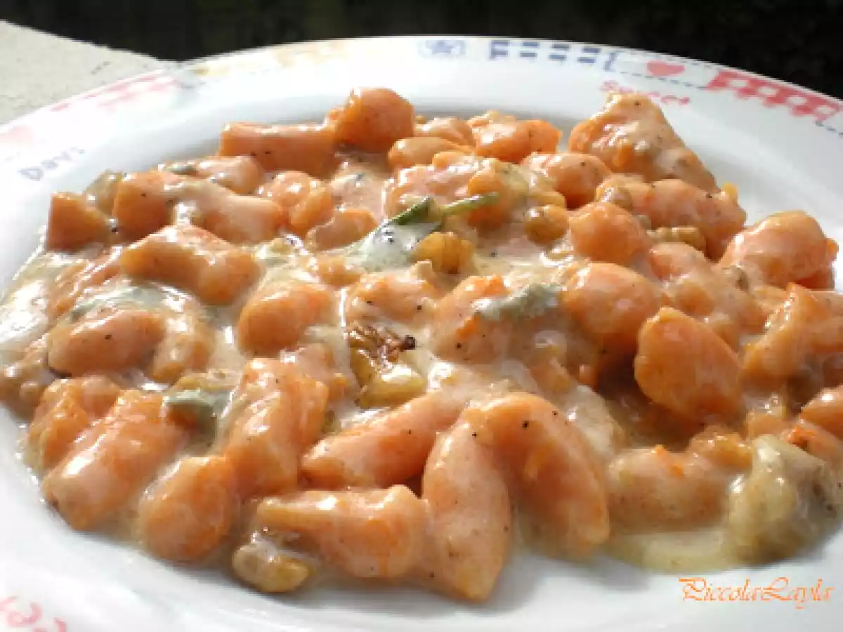 Chicche di zucca con gorgonzola e noci PrecedenteProssimo Portata principalefacile45 min Invia questa ricetta ad un amico Stampa la ricetta Contatta l'autore della Ricetta Pubblica la foto di questa ricetta Ingredienti 4 per le chicche:1/2 kg di Zucca pulita 3 patate medie 1 tuorlo d uovo farina qb sale pepe nero noce moscata per il condimento: 2 noci di burro 4 foglie di salvia 100g di gorgonzola dolce 10 gherighi di noci 1/2 bicchiere di latte sale pepe nero noce moscata formaggio grattug