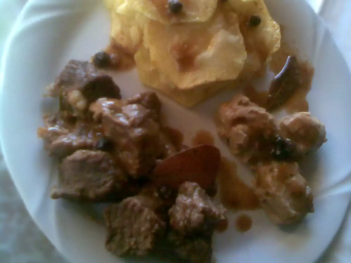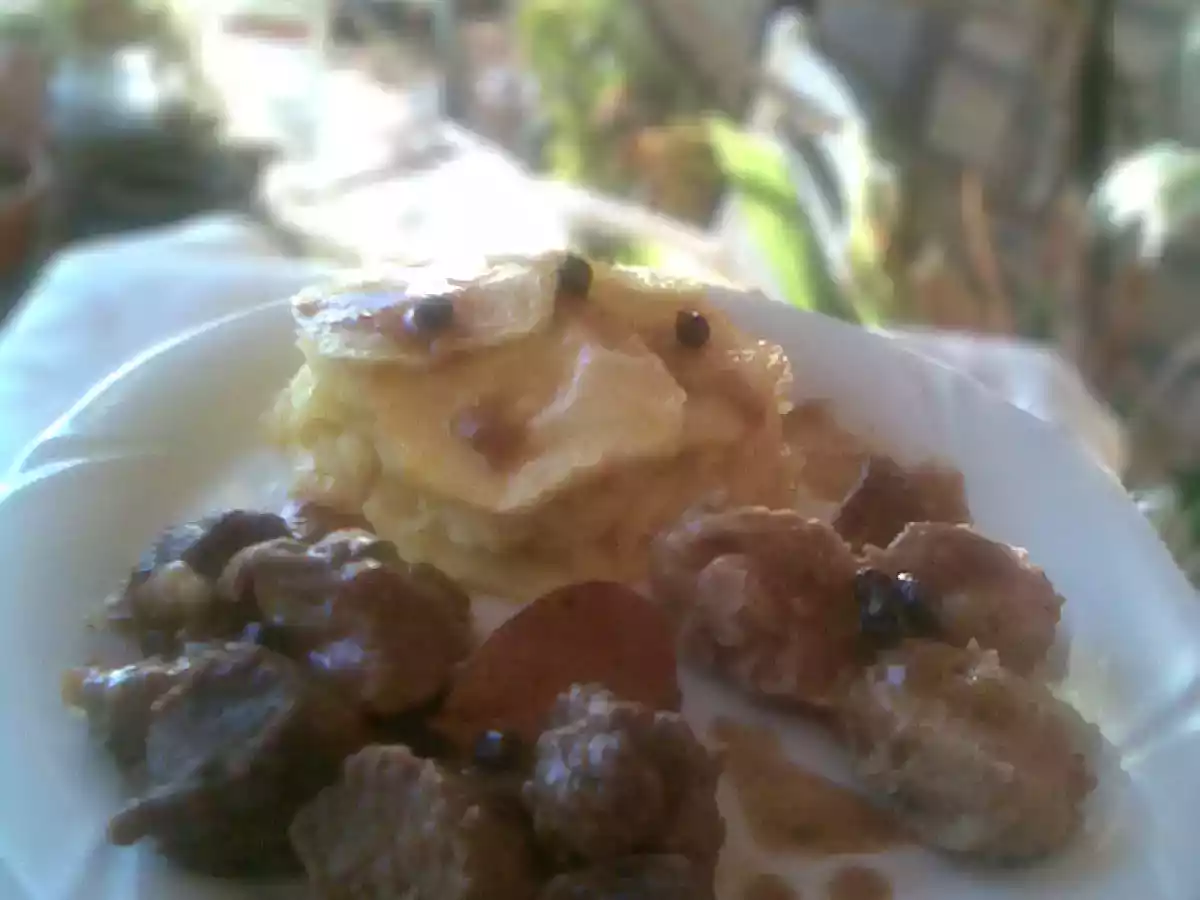 Cinghiale alle bacche di ginepro con purea di castagne e tortino di mele e patate