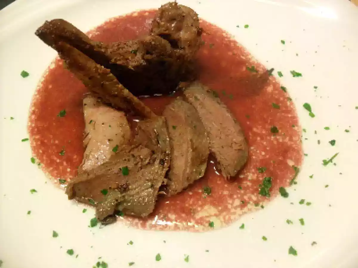 - Unite altro vino al fondo di cottura e fate restringere, aggiustate di sale, filtrate e disponete la riduzione a specchio sui piatti, sopra adagiatevi il colombaccio disossat, e servite.