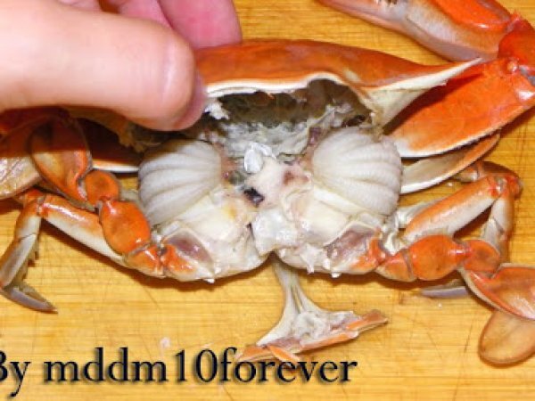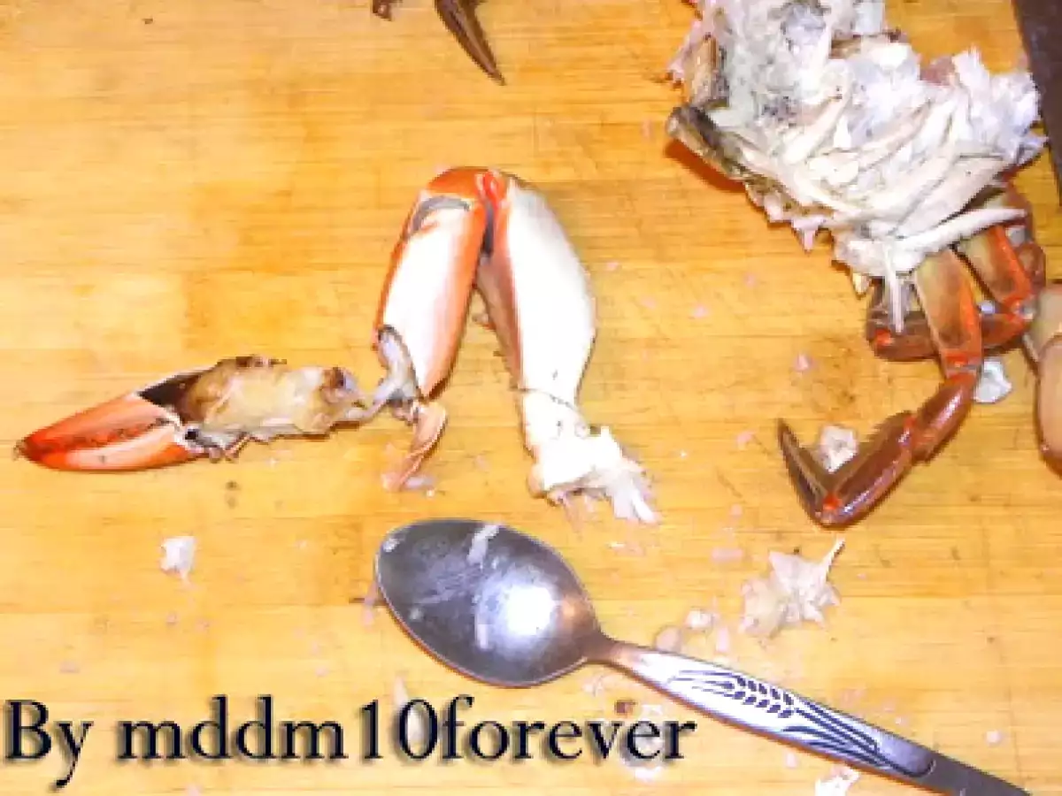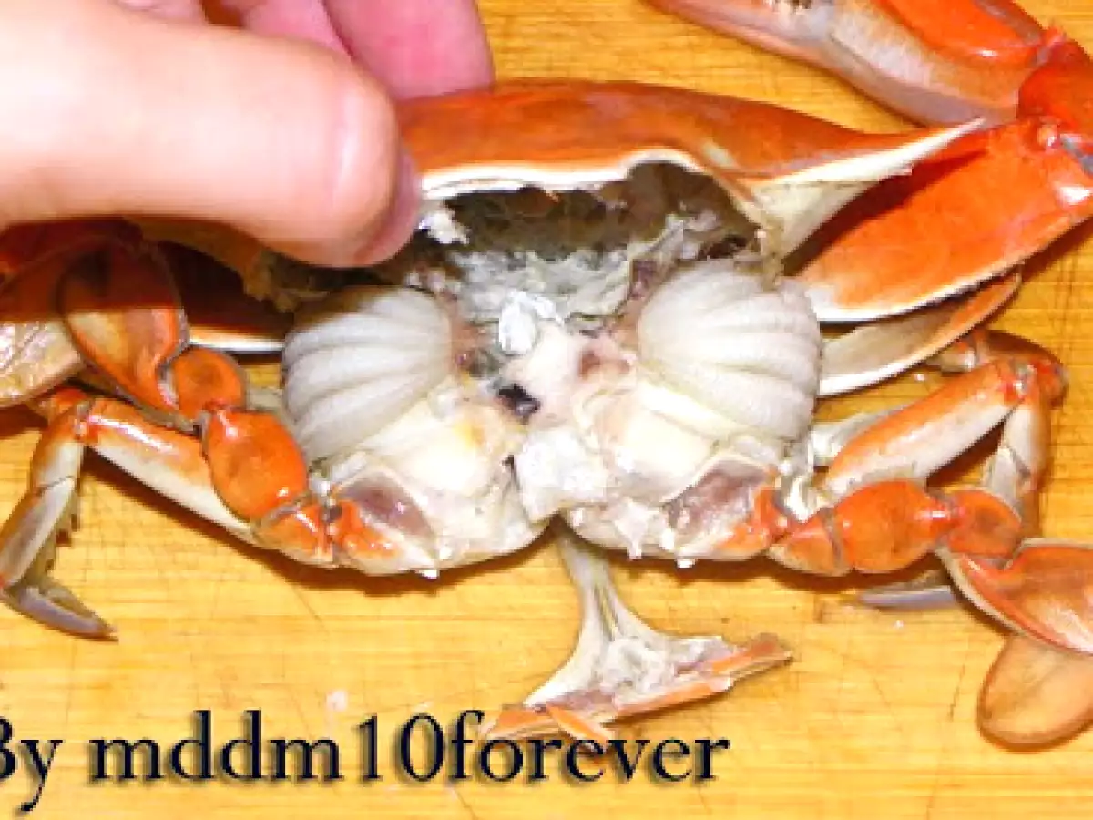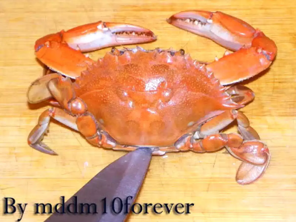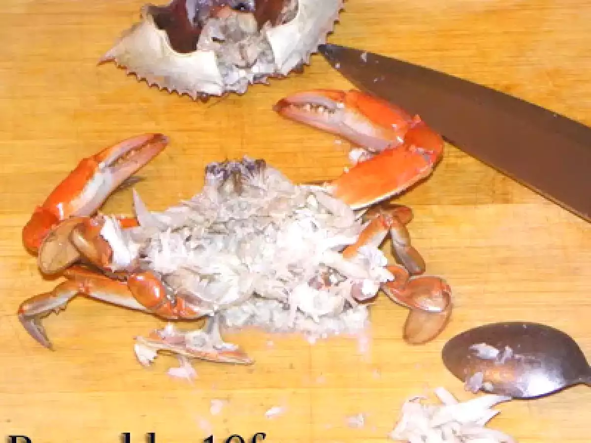 - Prendete un granchio e posizionatelo sul tagliere in posizione prona,aiutatevi con la punta del coltello ad alzare e togliere delicatamente il carapace.