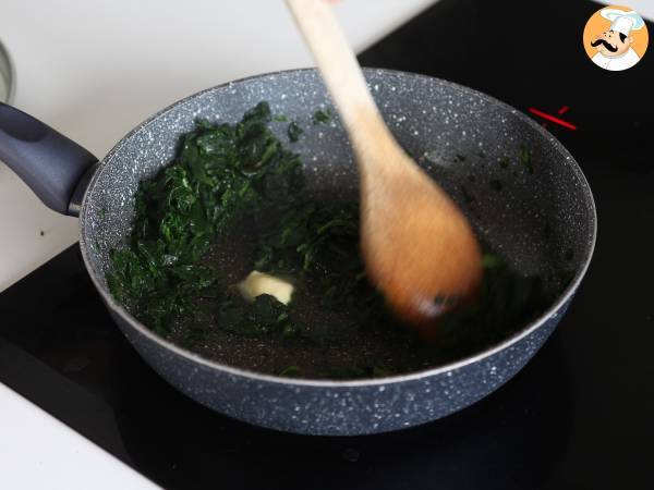 Lasciateli appassire e a fine cottura aggiungete una noce di burro. Quindi mescolate per bene. (Se utilizzate gli spinaci congelati versateli in padella, coprite con il coperchio e iniziate la cottura a fuoco lento, poi alzate a fuoco medio)