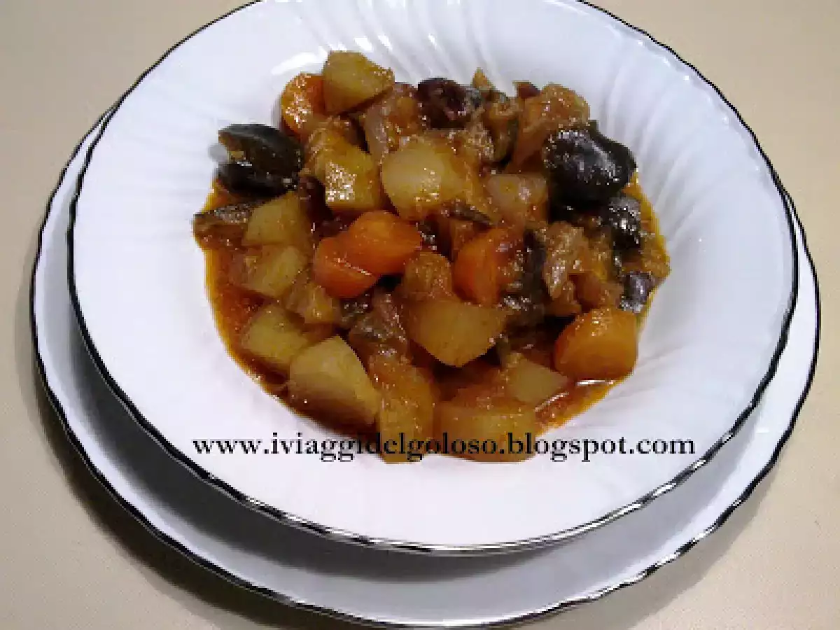 Mettiamo in una casseruola con l'olio d'oliva le cipolle, le melanzane e rosoliamo leggermente, uniamo poi il prezzemolo con l'aglio tritati, aggiungiamo le carote, le patate, il concentrato di pomodoro, il sale e l'acqua che copra quasi le verdure nella pentola. Lasciamo cuocere sino a che le patate e le carote siano cotte e il sughetto ristretto (circa un ora). - Serviamo caldo o tiepido a seconda dei gusti, d?estate è ottimo anche freddo (non di frigo naturalmente). Questa è la nostra versione invernale con quello che avevamo a disposizione, ma possiamo farlo con altre verdure secondo i gusti e le stagioni, oppure aggiungere altre qualità di verdure a questa versione, soprattutto le zucchine, specialmente le trombette quelle curve che abbiamo noi qui in Liguria che però in questo periodo non sono ancora disponibili, bisognerà quindi aspettare l'estate!
