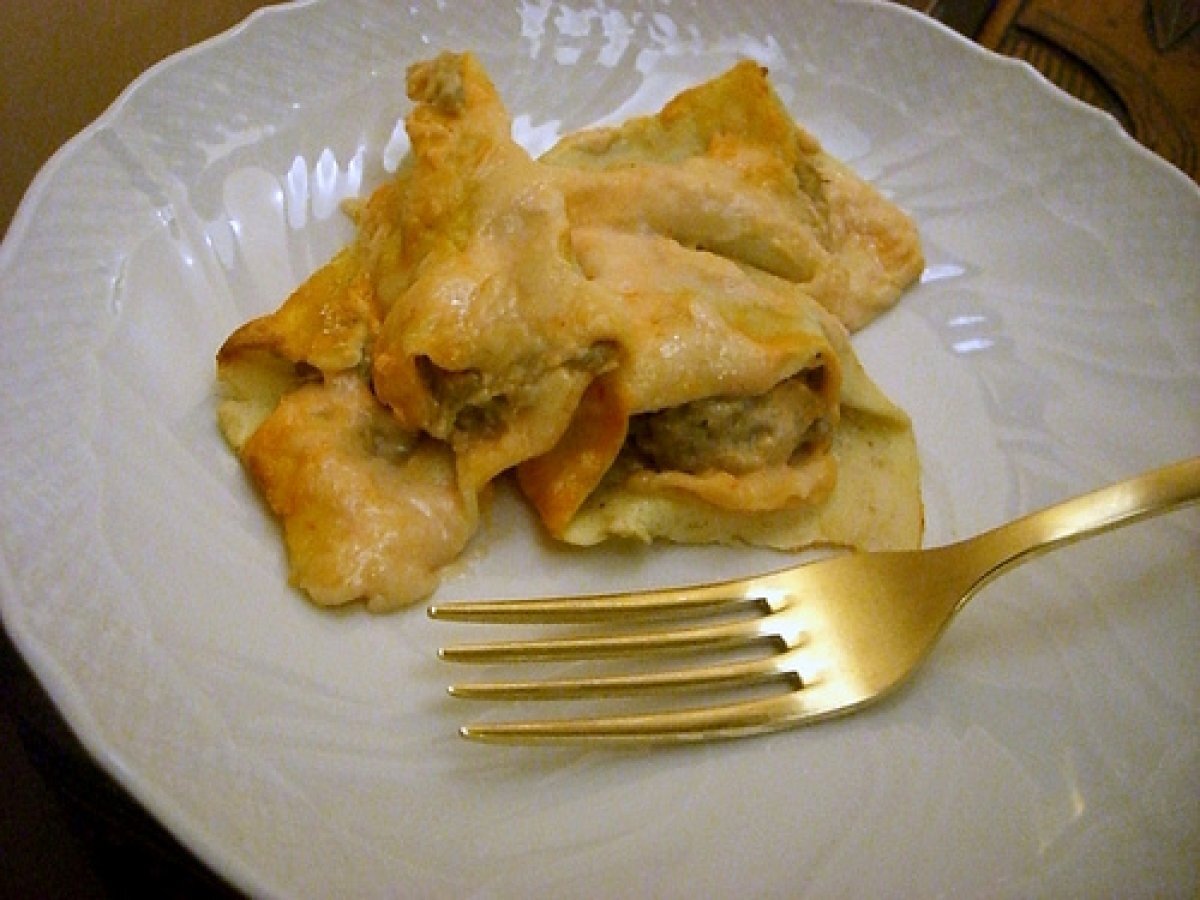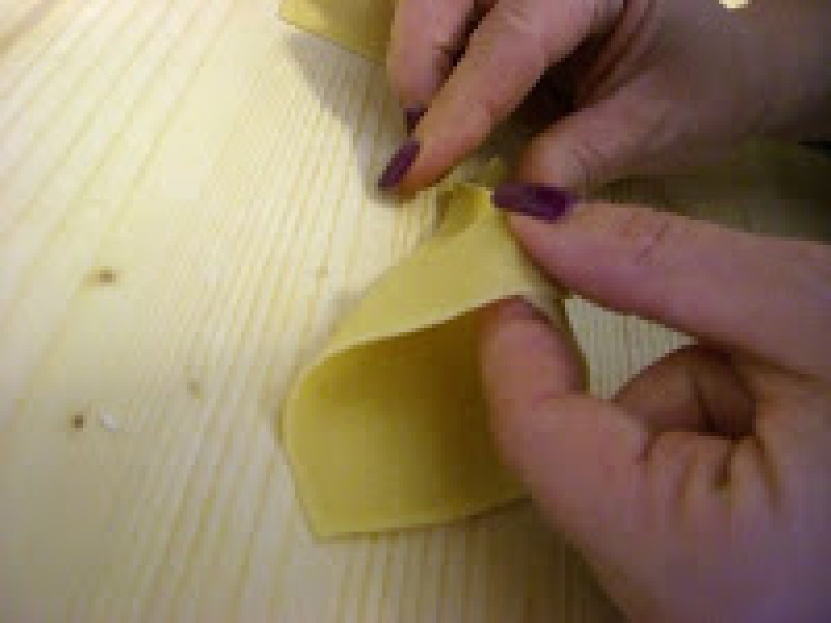 Cornucopie augurali.....ovvero: pasta fresca con ripieno di carciofi delle simili PrecedenteProssimo Portata principalefacile42 min Invia questa ricetta ad un amico Stampa la ricetta Contatta l'autore della Ricetta Pubblica la foto di questa ricetta Ingredienti 10 Sfoglia di 3 uova Ripieno: 10 carciofi 150 g prosciutto di parma dolce tagliato sottile 150 g prosciutto cotto 50 g mollica di pane 100 g parmigiano grattugiato 3 tuorli d'uovo sale, pepe e noce moscata Sugo rosa alla panna: 500 ml panna fresca 20 g farina 20 g burro 8/10 cucchiai di passata di pomodoro