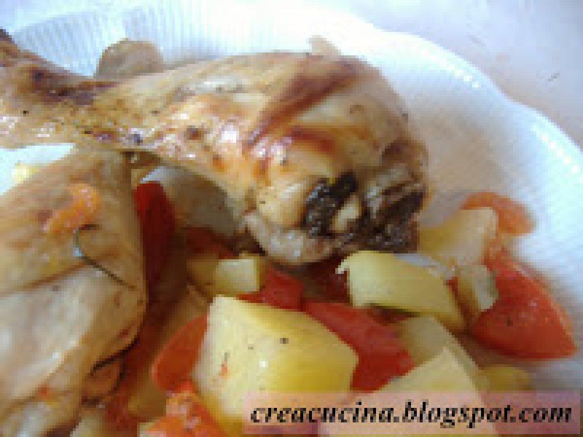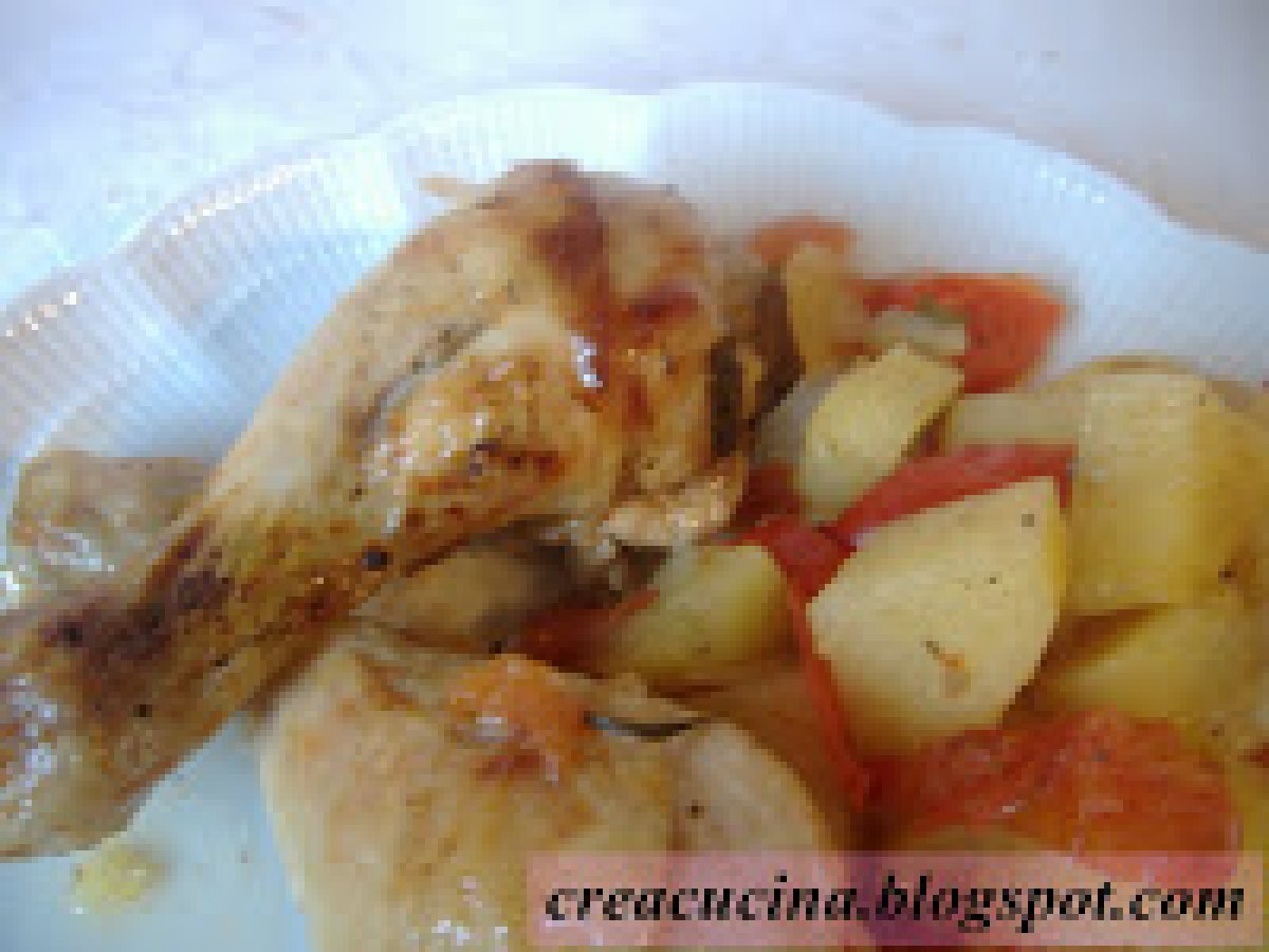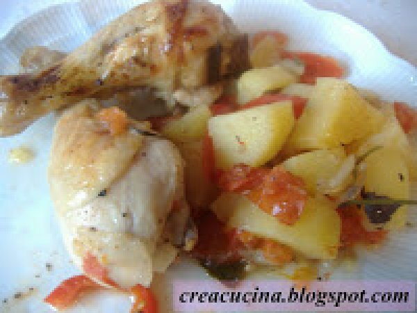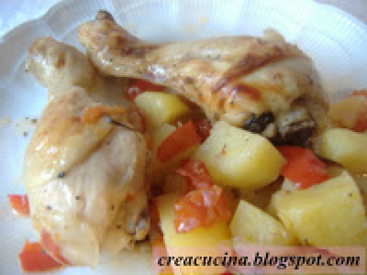 Cosce di pollo "alla contadina" PrecedenteProssimo Portata principalefacile1 h 20 m401 Kcal Invia questa ricetta ad un amico Stampa la ricetta Contatta l'autore della Ricetta Pubblica la foto di questa ricetta Ingredienti 6 6 cosce di pollo una cipolla un peperone 3/4 patate a tocchetti 50 g di burro rosmarino abbondante qualche foglia di salvia 4 pomodori tondi a grappolo sale e pepe un limone Costo stimato: 9.68Euros€ (1.61€/Porzioni)