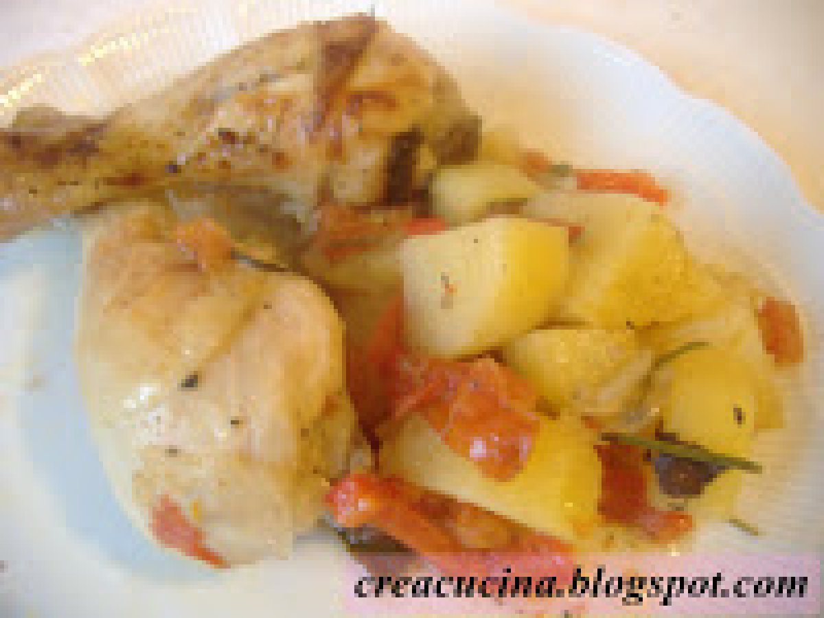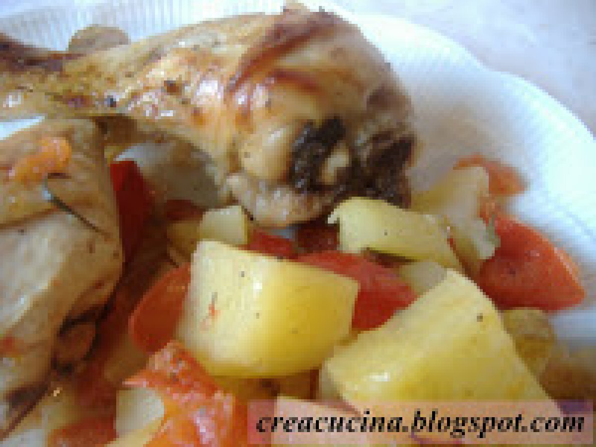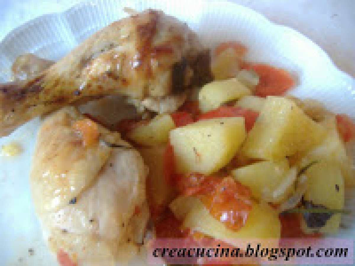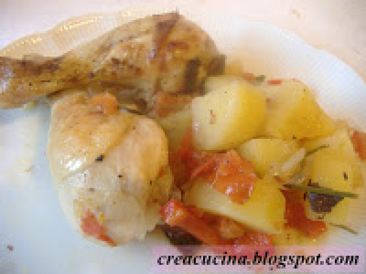 Cosce di pollo "alla contadina" PrecedenteProssimo Portata principalefacile1 h 20 m401 Kcal Invia questa ricetta ad un amico Stampa la ricetta Contatta l'autore della Ricetta Pubblica la foto di questa ricetta Ingredienti 6 6 cosce di pollo una cipolla un peperone 3/4 patate a tocchetti 50 g di burro rosmarino abbondante qualche foglia di salvia 4 pomodori tondi a grappolo sale e pepe un limone Costo stimato: 9.68Euros€ (1.61€/Porzioni)